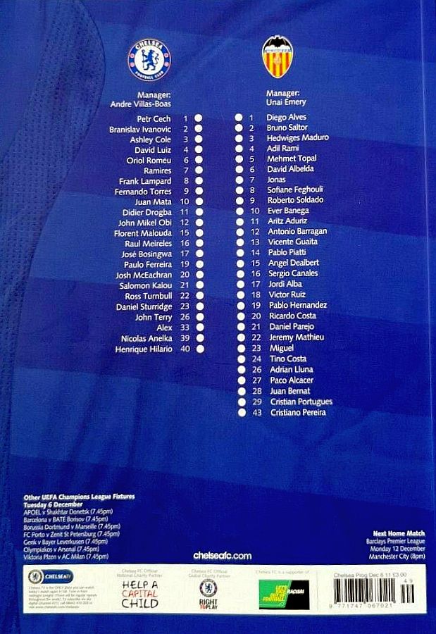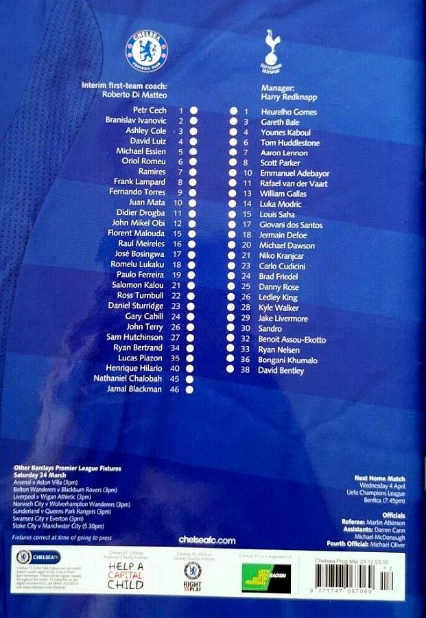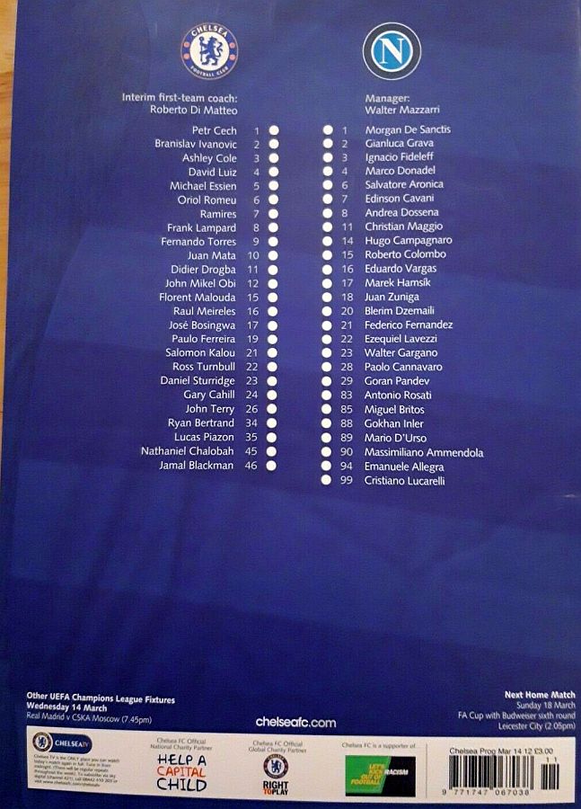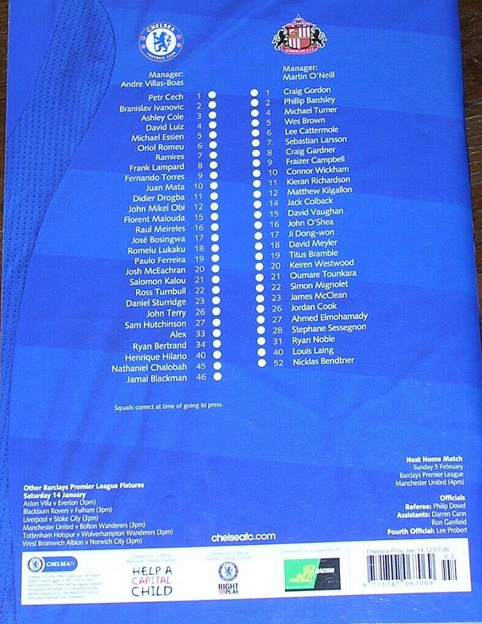 1 Petr Cech, 5 Michael Essien, 6 Oriol Romeu (12 Mikel Obi 66), 9 Fernando Torres, 15 Florent Malouda, 17 Jose Bosingwa, 21 Salomon Kalou (10 Juan Mata 74), 23 Daniel Sturridge, 24 Gary Cahill, 26 John Terry, 34 Ryan Bertrand ( 3 Ashley Cole 77) |
