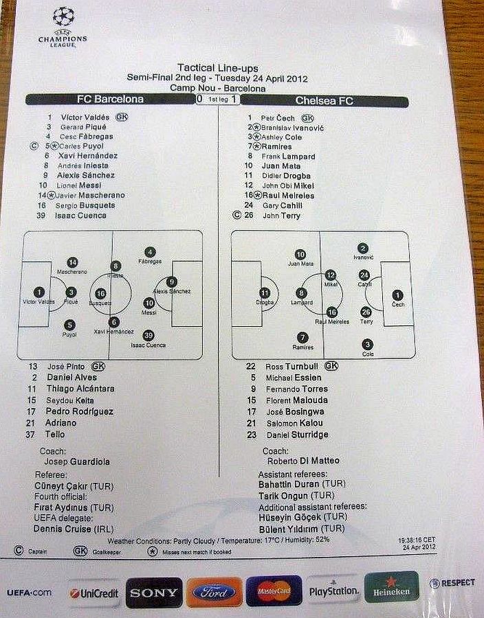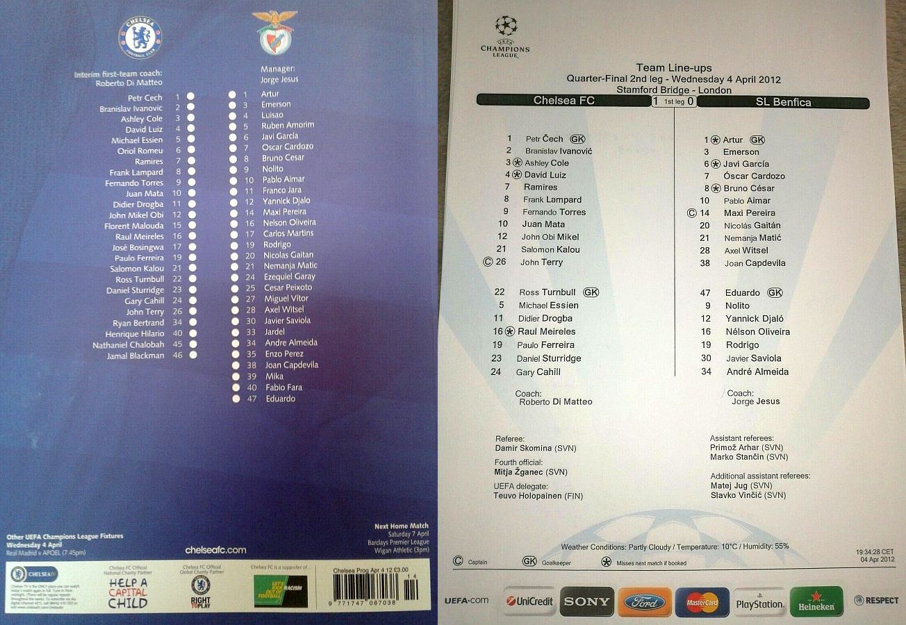 Obi 32, Ramires 45, Ivanovic 51, Cech 59, Lampard 72, Meireles 89 |