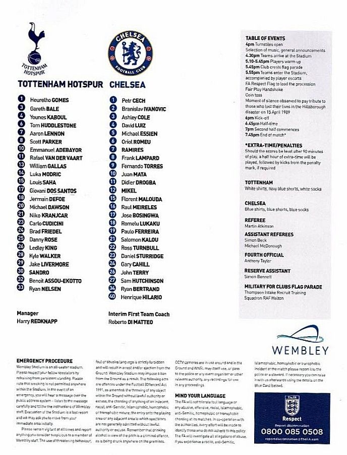 1 Petr Cech, 3 Ashley Cole, 4 David Luiz, 8 Frank Lampard, 10 Juan Mata, 11 Didier Drogba, 12 Mikel Obi, 17 Jose Bosingwa, 21 Salomon Kalou ( 9 Fernando Torres 85), 24 Gary Cahill, 34 Ryan Bertrand (15 Florent Malouda 73) |