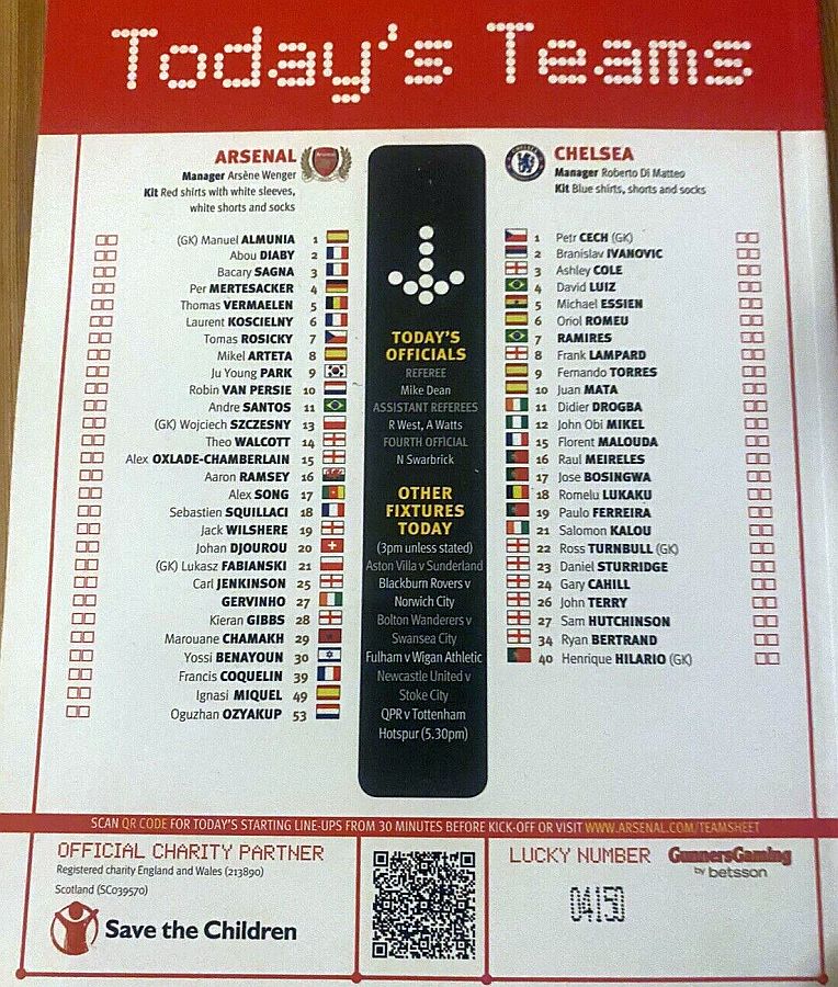 Wojciech Szczesny, Bakary Sagna, Laurent Koscielny, Thomas Vermaelen, Kieran Gibbs, Aaron Ramsey, Alex Song, Theo Walcott (Gervinho 60), Tomas Rosicky (Abou Diaby 64), Alex Oxlade-Chamberlain (Andre Santos 70), Robin van Persie |