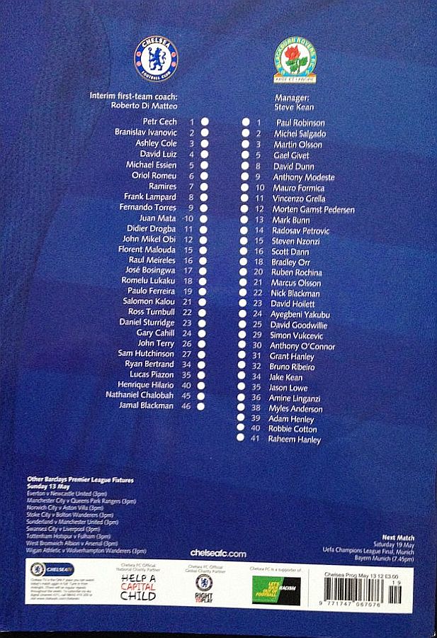 40 Henrique Hilario, 2 Branislav Ivanovic, 3 Ashley Cole, 7 Ramires, 8 Frank Lampard, 9 Fernando Torres (18 Romelu Lukaku 83), 11 Didier Drogba (39 Nicolas Anelka 71), 12 Mikel Obi, 15 Florent Malouda (10 Juan Mata 68), 17 Jose Bosingwa, 26 John Terry |
