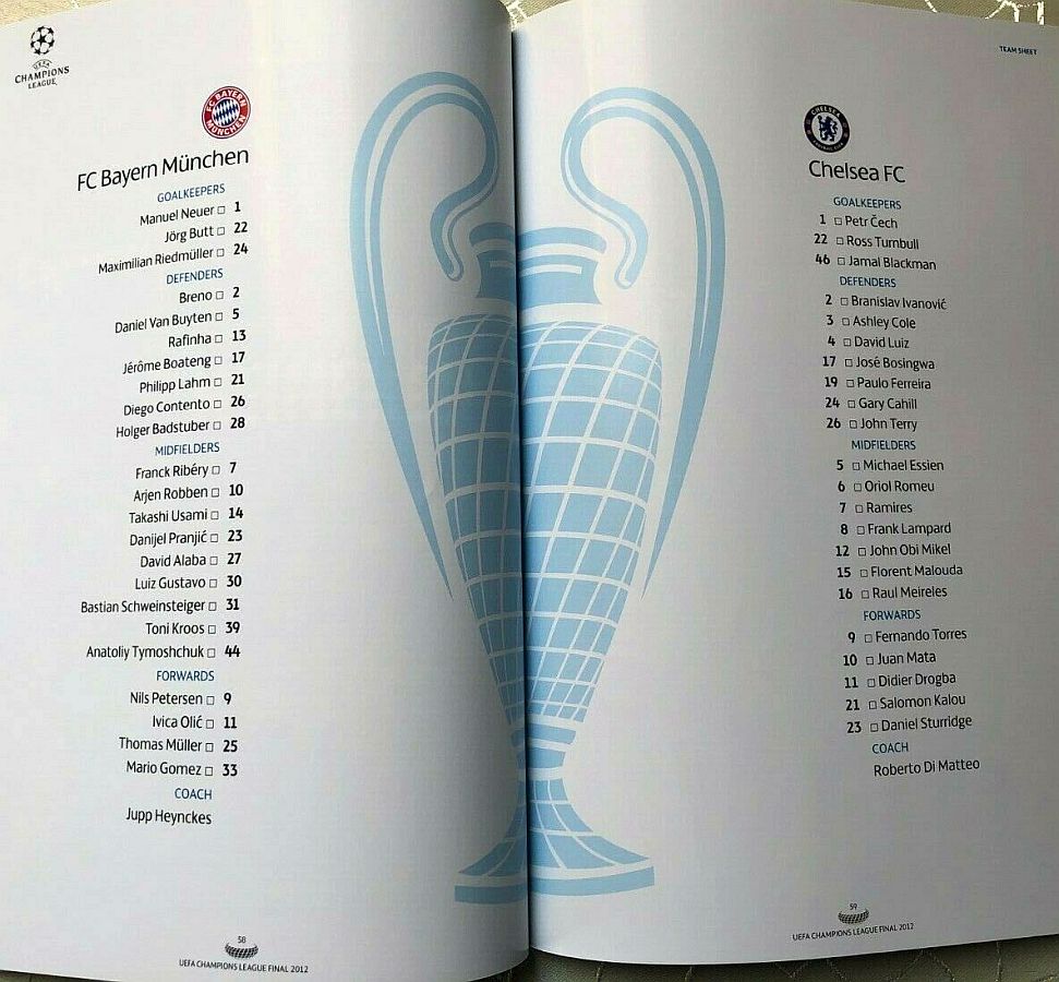 1 Petr Cech, 2 Branislav Ivanovic, 3 Ashley Cole, 7 Ramires, 8 Frank Lampard, 10 Juan Mata (21 Salomon Kalou 58), 11 Didier Drogba ( 9 Fernando Torres 80), 12 Mikel Obi, 16 Raul Meireles, 24 Gary Cahill (17 Jose Bosingwa 13), 26 John Terry |