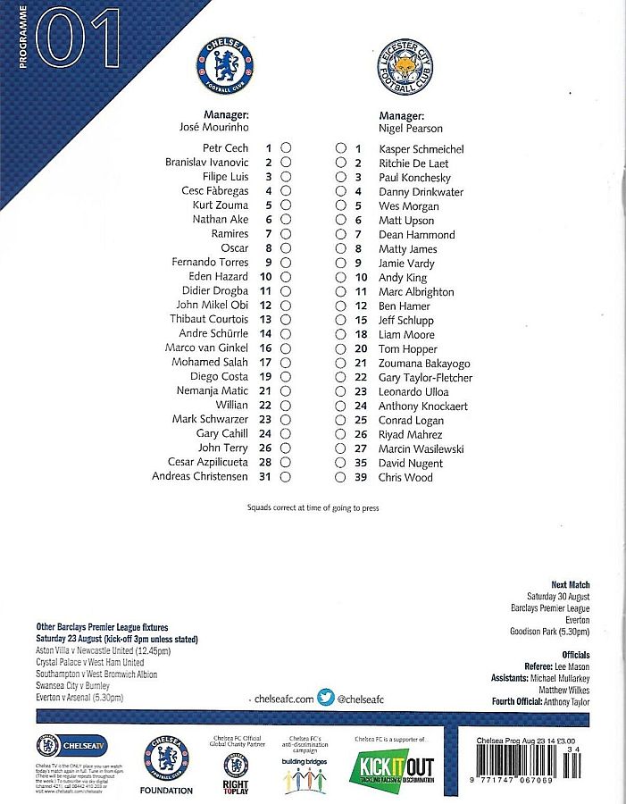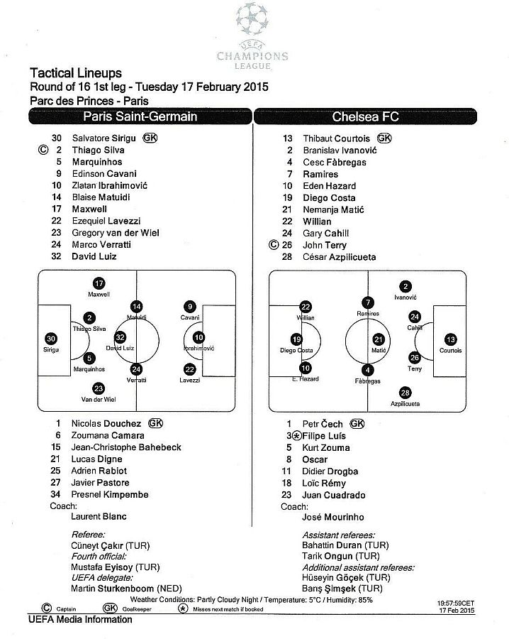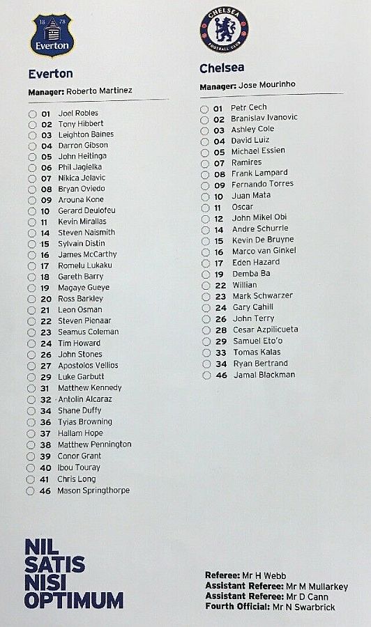 13 Thibaut Courtois, 2 Branislav Ivanovic, 4 Cesc Fabregas ( 5 Kurt Zouma 90), 7 Ramires, 8 Oscar (11 Didier Drogba 46), 10 Eden Hazard, 21 Nemanja Matic, 22 Willian (23 Juan Cuadrado 90), 24 Gary Cahill, 26 John Terry, 28 Cesar Azpilicueta |