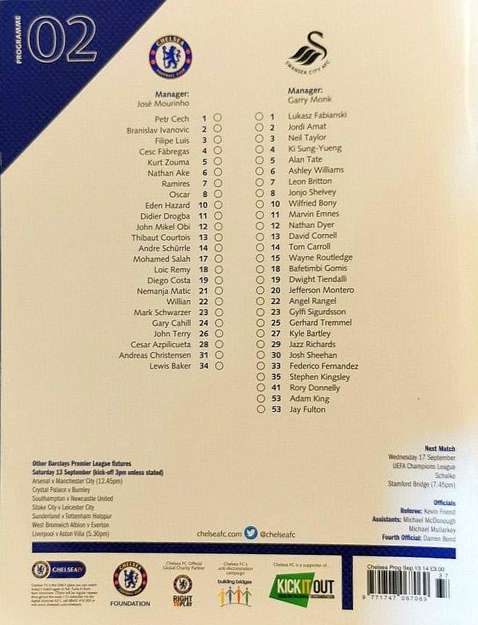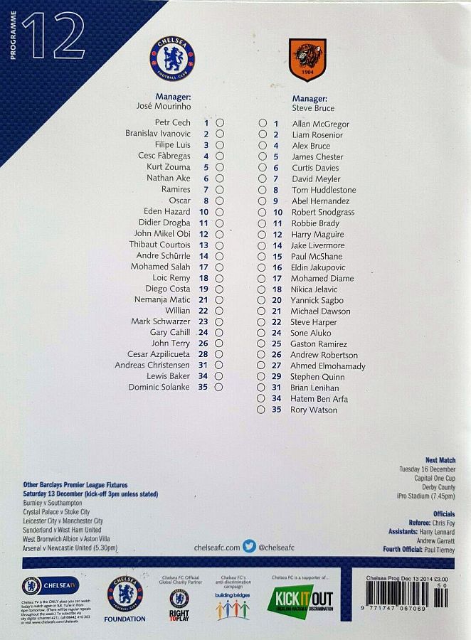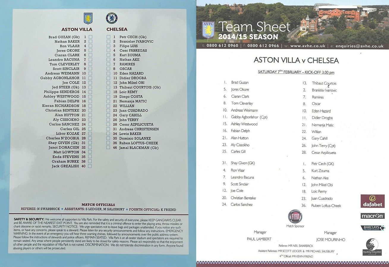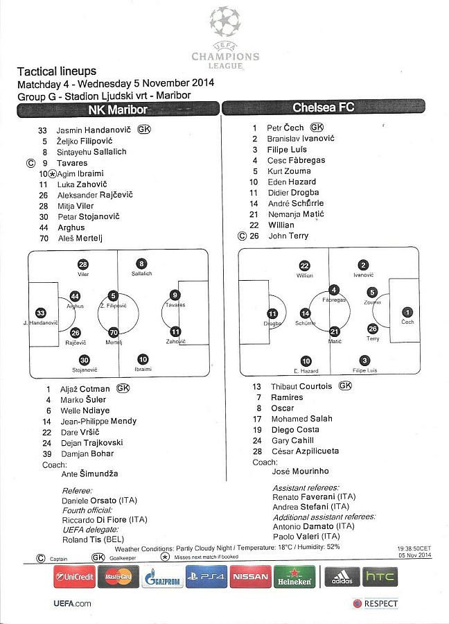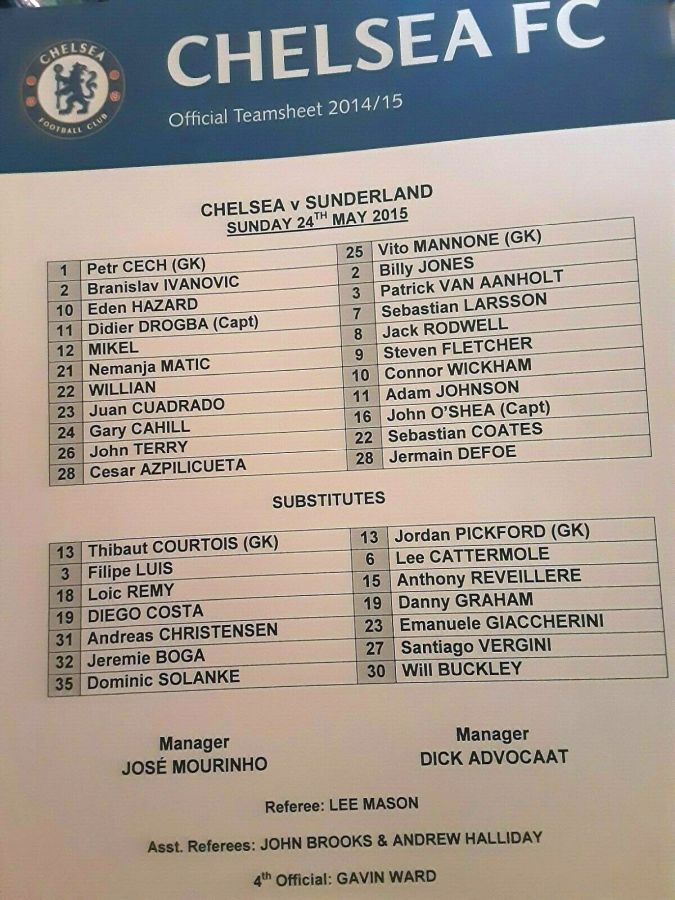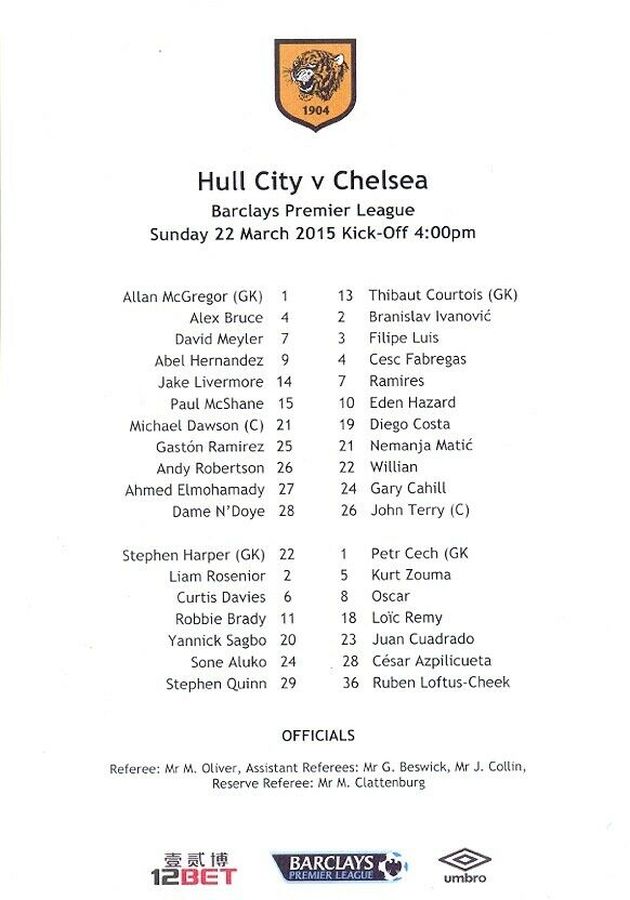 13 Thibaut Courtois, 2 Branislav Ivanovic, 4 Cesc Fabregas, 10 Eden Hazard ( 3 Filipe Luis 90), 11 Didier Drogba, 21 Nemanja Matic, 22 Willian ( 5 Kurt Zouma 85), 24 Gary Cahill, 26 John Terry, 28 Cesar Azpilicueta, 23 Juan Cuadrado (12 Mikel Obi 46) |