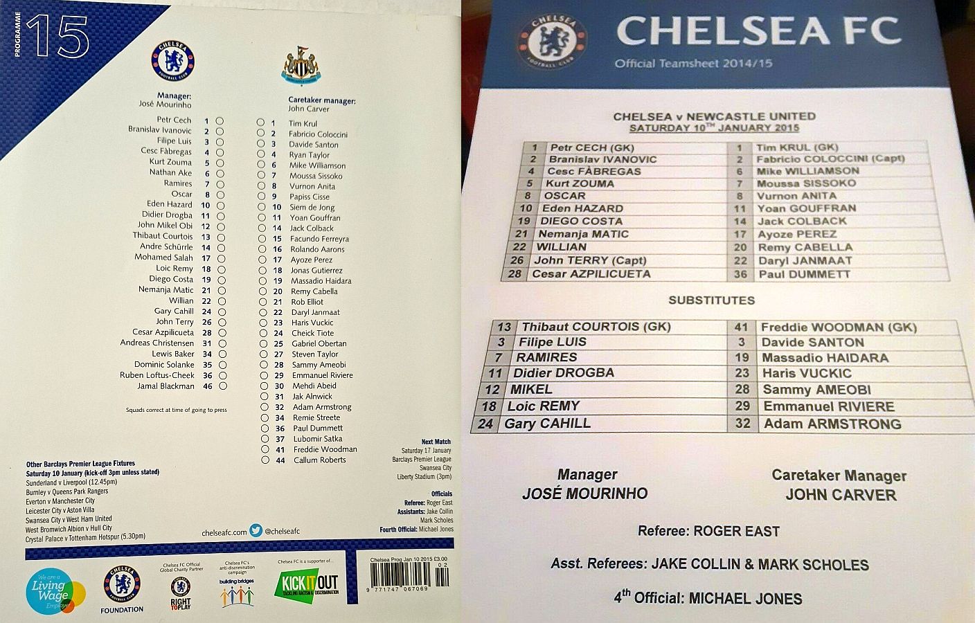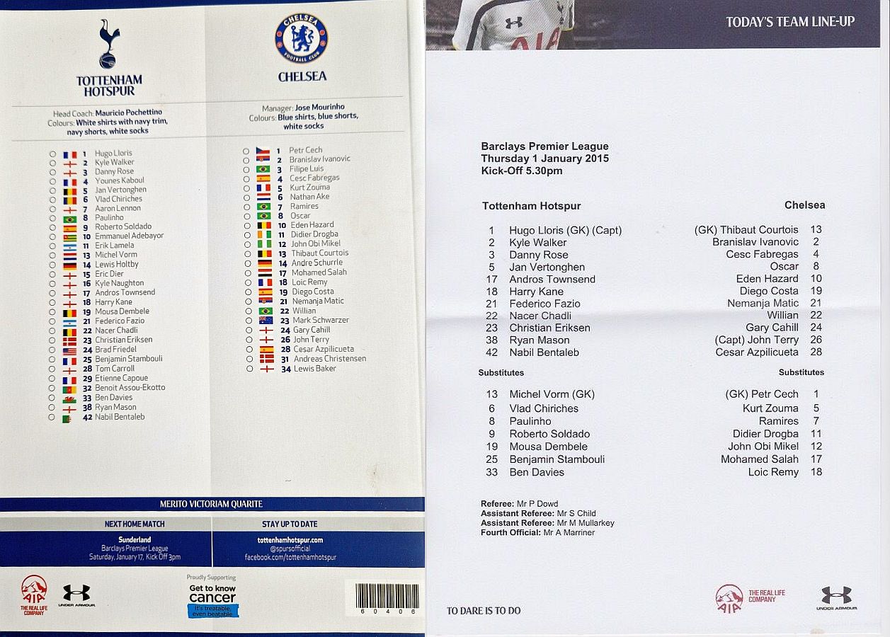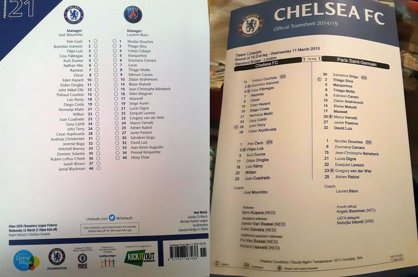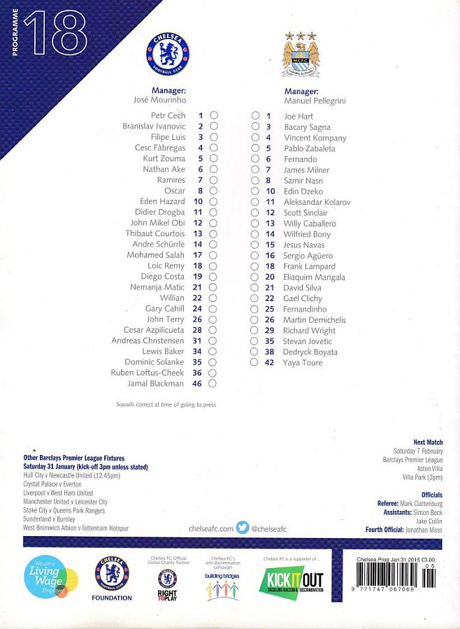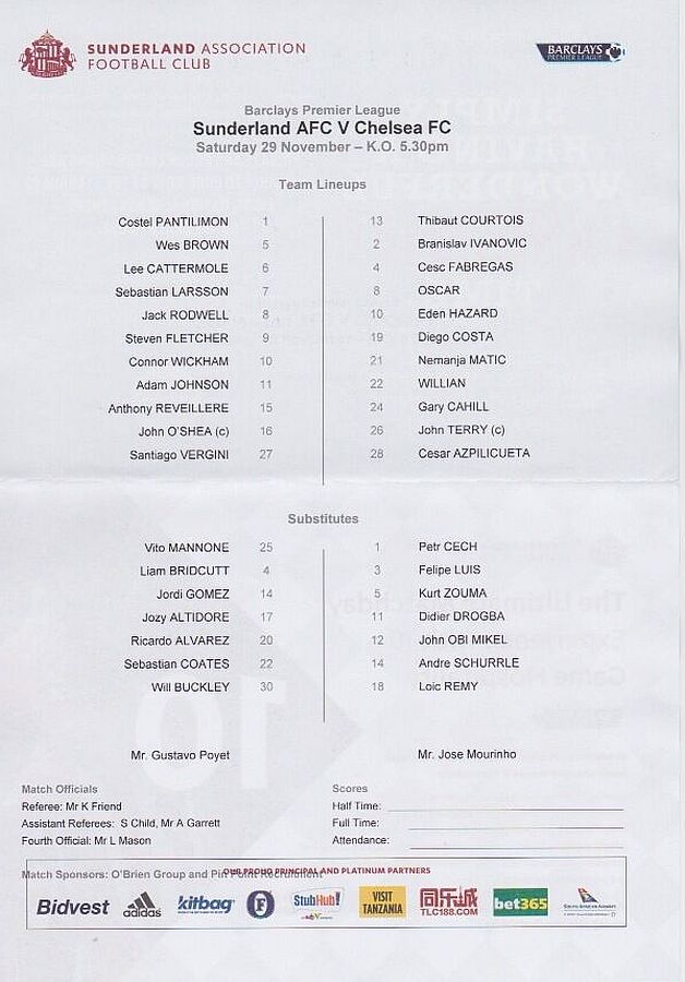 13 Thibaut Courtois, 2 Branislav Ivanovic, 4 Cesc Fabregas, 10 Eden Hazard ( 3 Filipe Luis 90), 11 Didier Drogba, 21 Nemanja Matic, 22 Willian ( 5 Kurt Zouma 85), 24 Gary Cahill, 26 John Terry, 28 Cesar Azpilicueta, 23 Juan Cuadrado (12 Mikel Obi 46) |