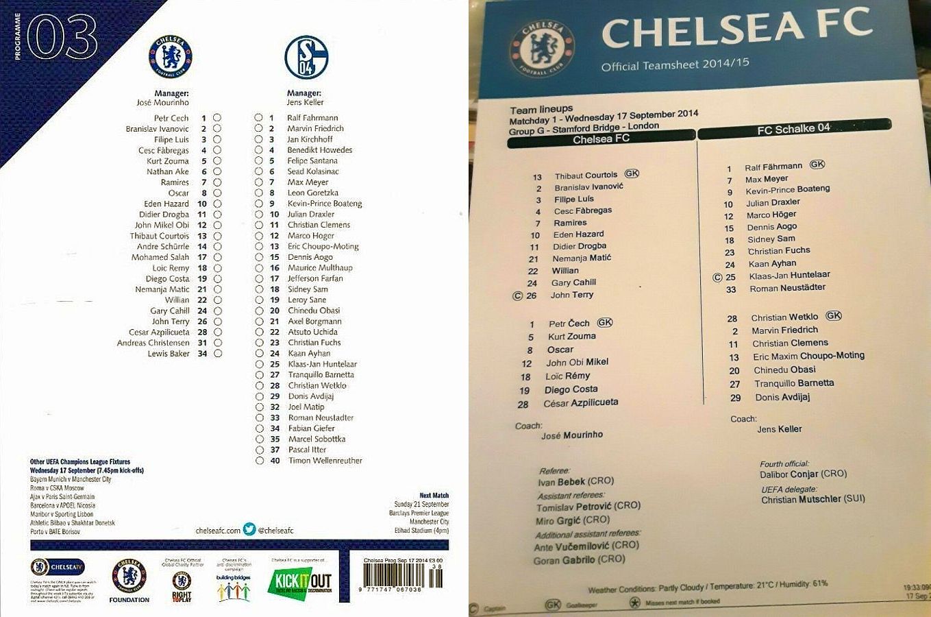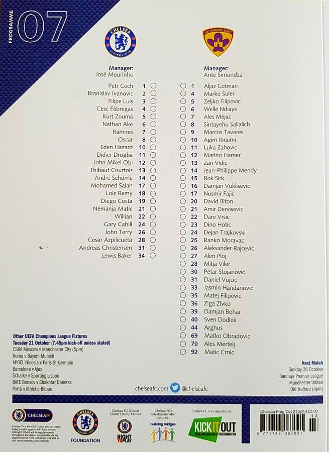 1 Petr Cech, 5 Kurt Zouma, 14 Andre Schurrle, 17 Mohamed Salah |