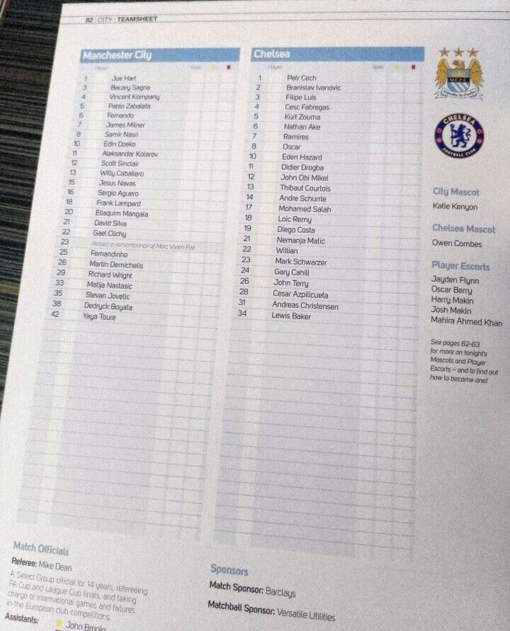 1 Petr Cech, 2 Branislav Ivanovic, 10 Eden Hazard, 11 Didier Drogba (19 Diego Costa 30), 12 Mikel Obi (31 Andreas Christensen 78), 21 Nemanja Matic, 22 Willian, 24 Gary Cahill, 26 John Terry, 28 Cesar Azpilicueta, 23 Juan Cuadrado (18 Loic Remy 44) |