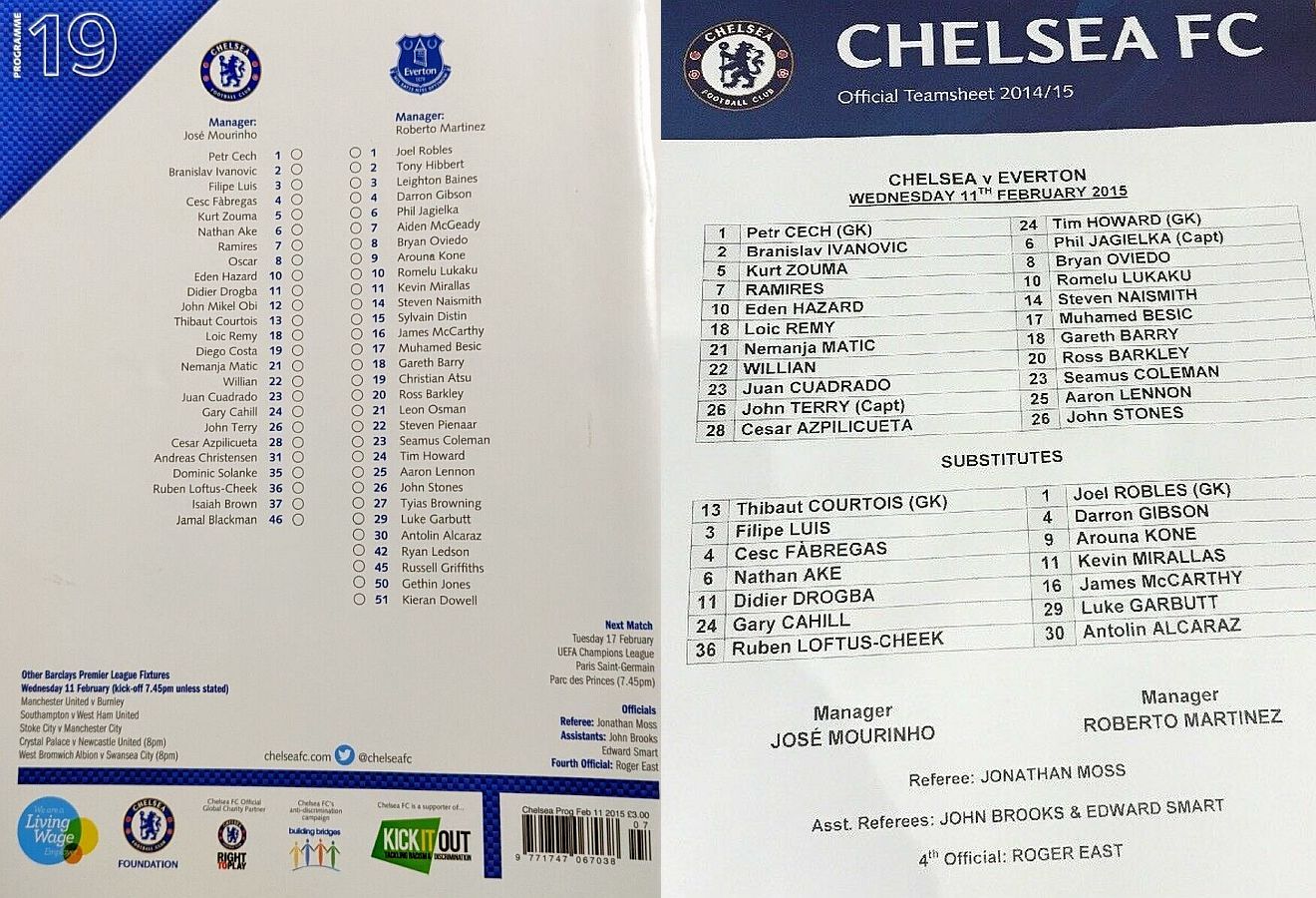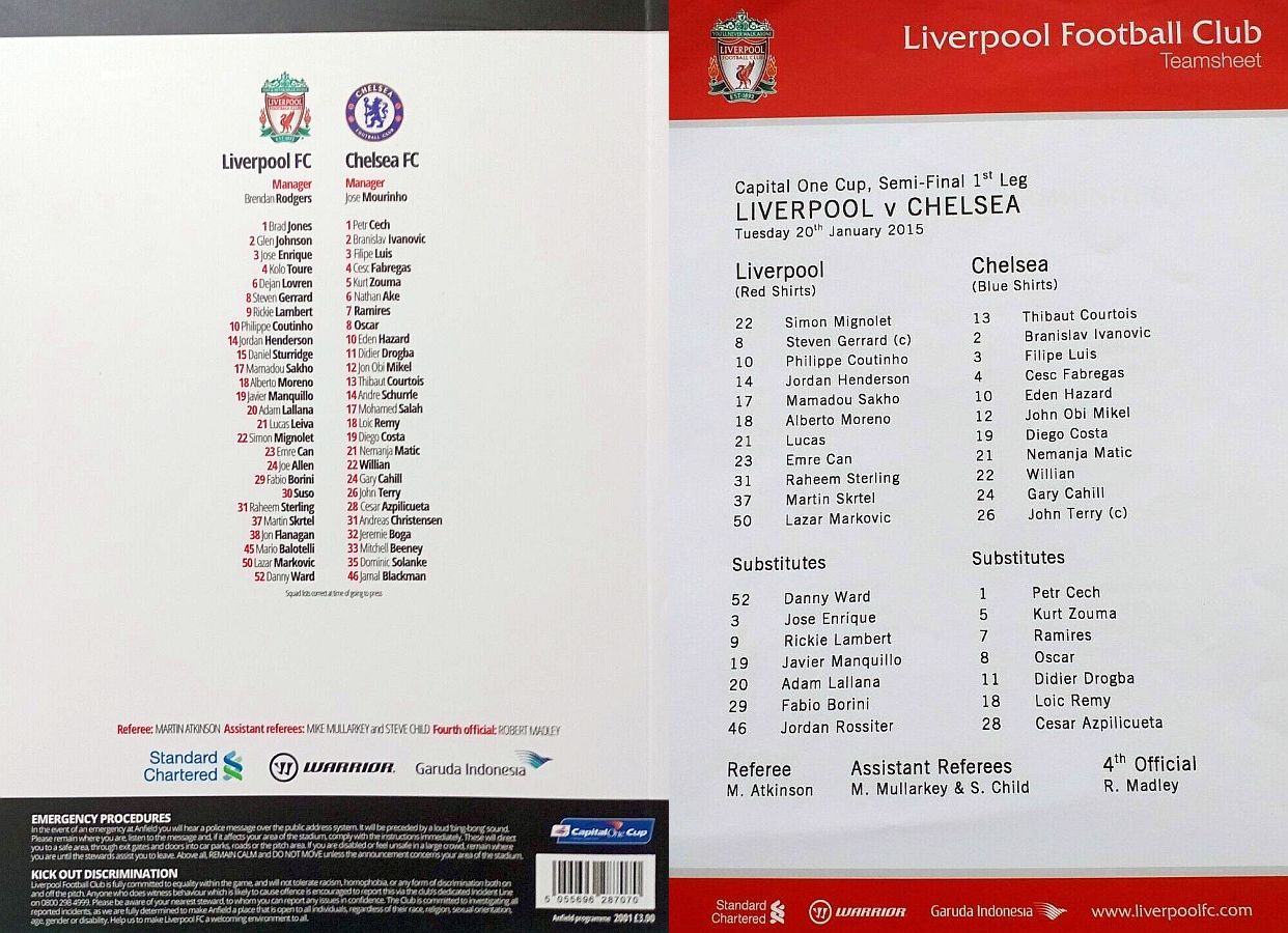 1 Petr Cech, 5 Kurt Zouma, 3 Filipe Luis, 12 Mikel Obi |