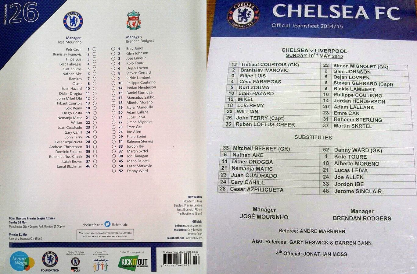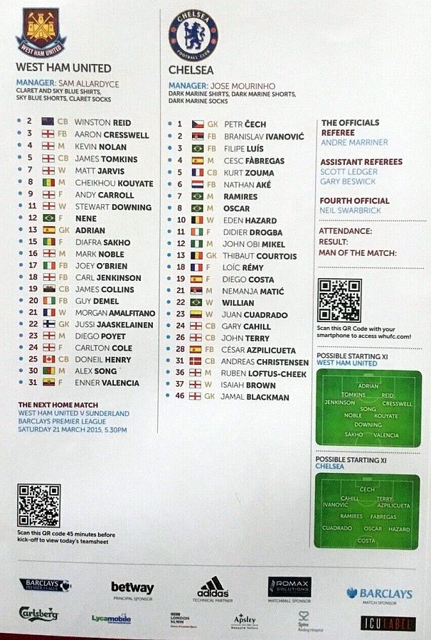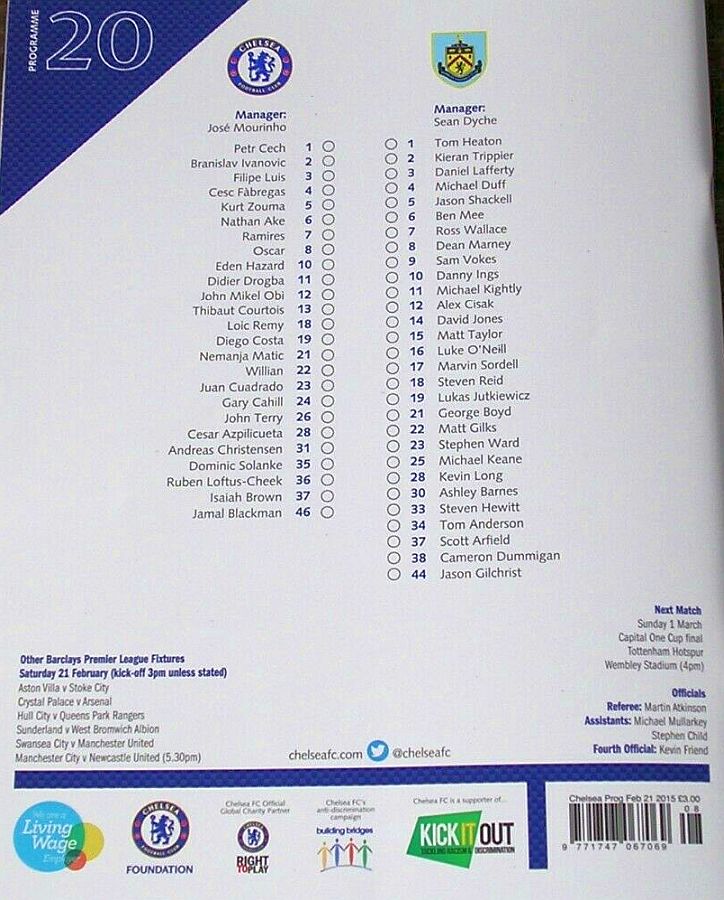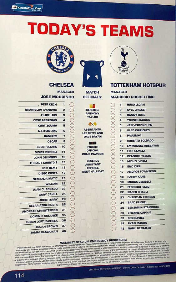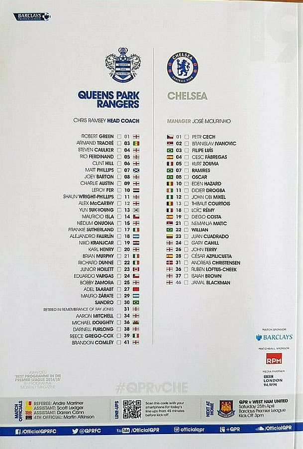 13 Thibaut Courtois, 2 Branislav Ivanovic, 3 Filipe Luis, 4 Cesc Fabregas, 5 Kurt Zouma (24 Gary Cahill 35), 10 Eden Hazard, 12 Mikel Obi, 18 Loic Remy (23 Juan Cuadrado 84), 22 Willian, 26 John Terry, 36 Ruben Loftus-Cheek (21 Nemanja Matic 60) |