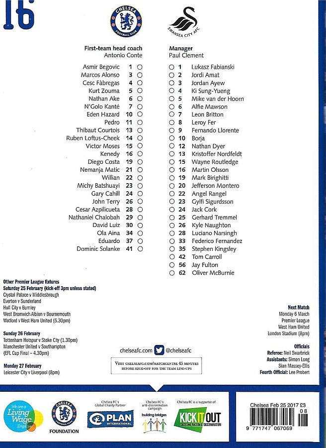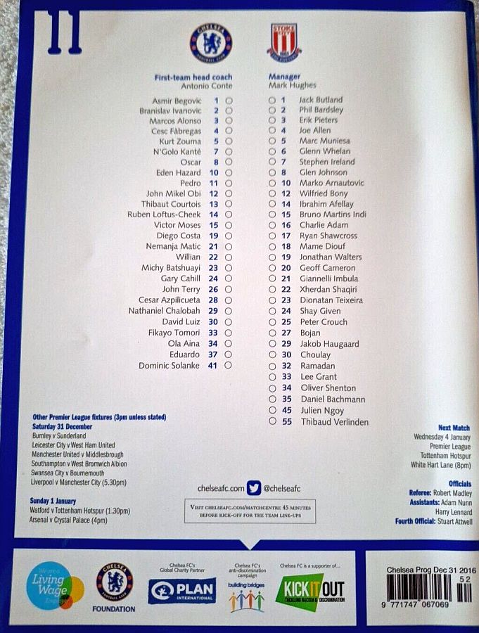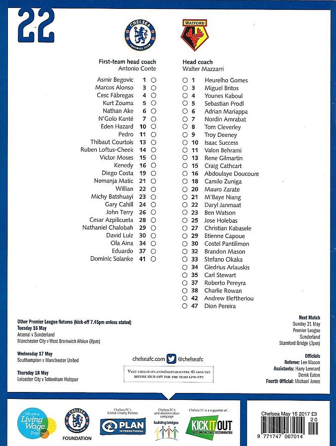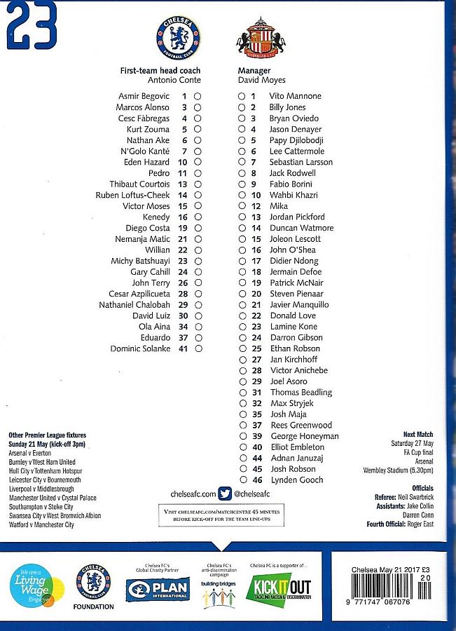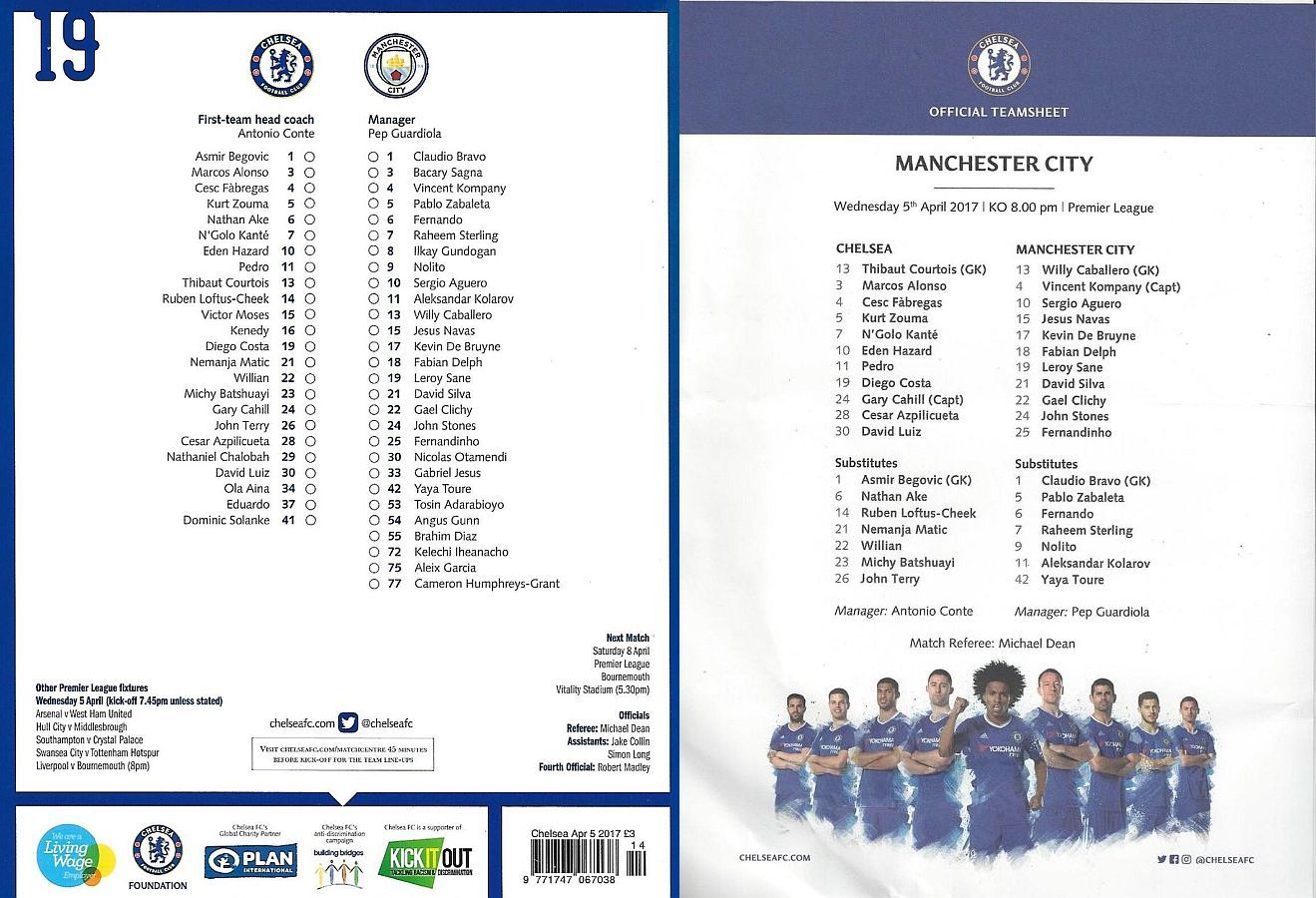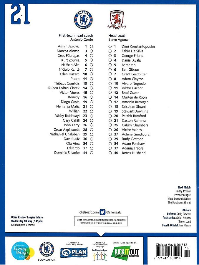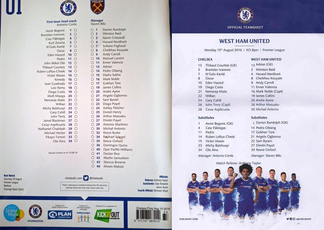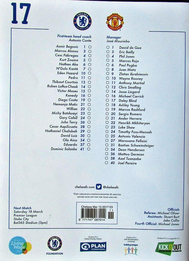 1 Asmir Begovic, 2 Branislav Ivanovic, 4 Cesc Fabregas, 11 Pedro (10 Eden Hazard 73), 14 Ruben Loftus-Cheek ( 8 Oscar 81), 15 Victor Moses, 21 Nemanja Matic, 23 Michy Batshuayi, 24 Gary Cahill, 28 Cesar Azpilicueta, 34 Ola Aina (26 John Terry 76) |