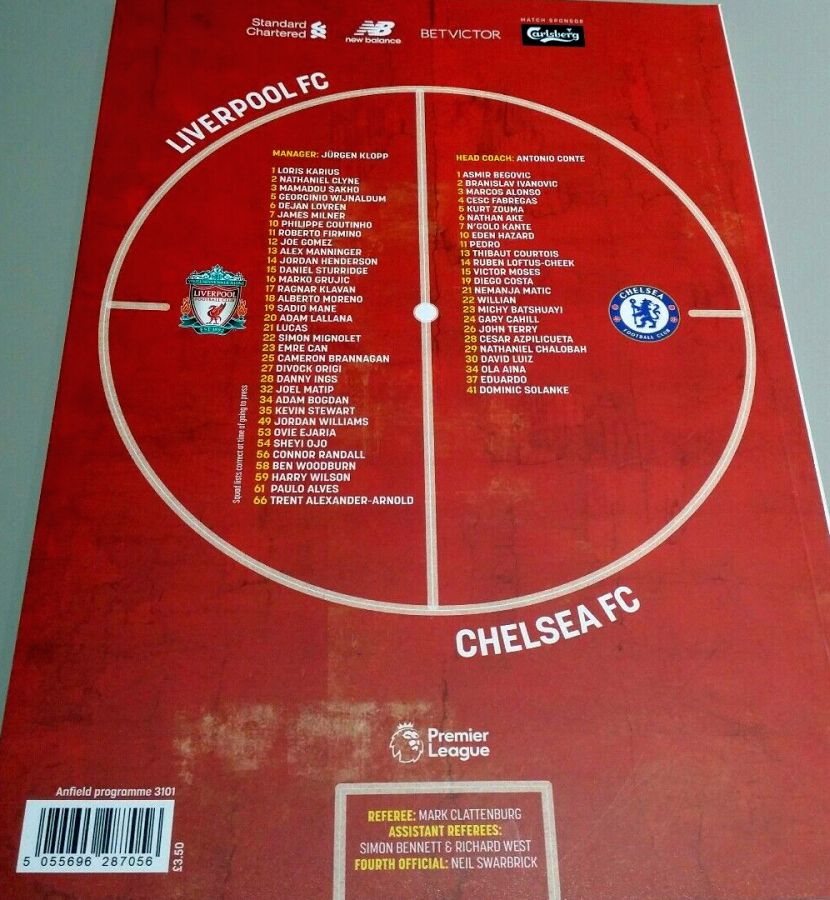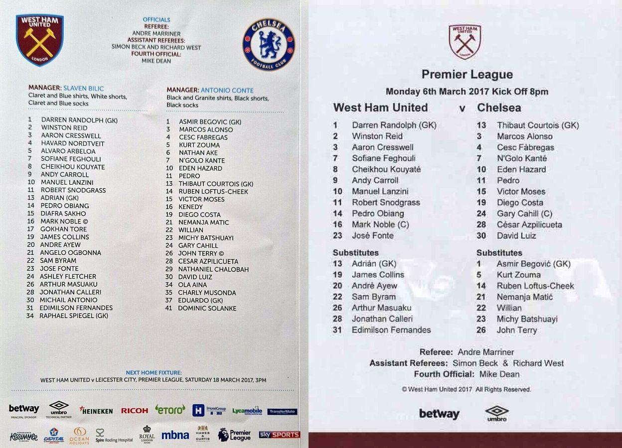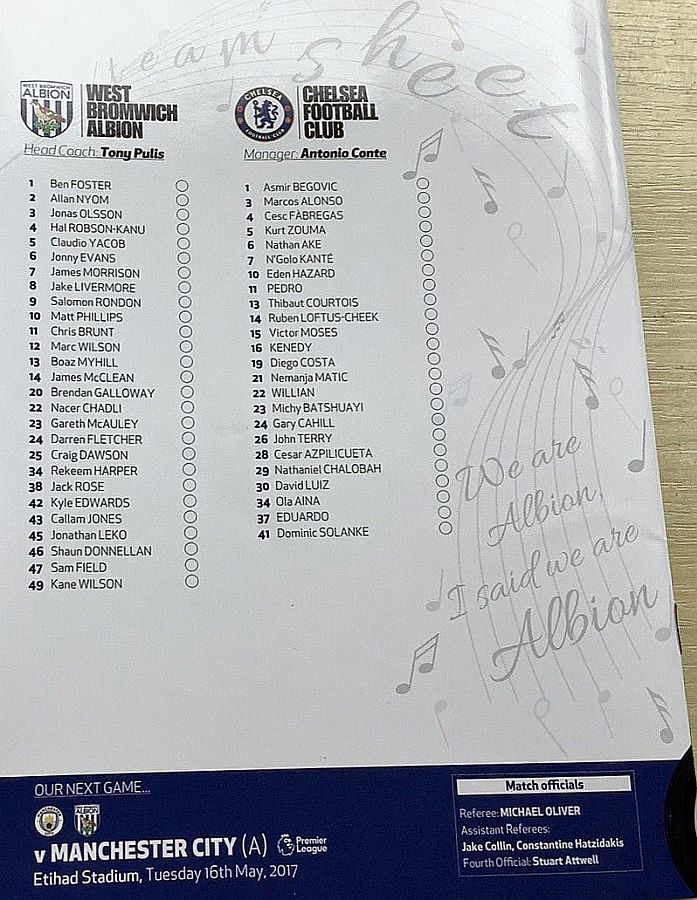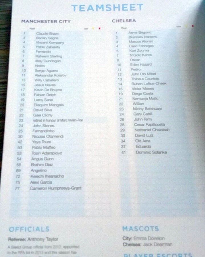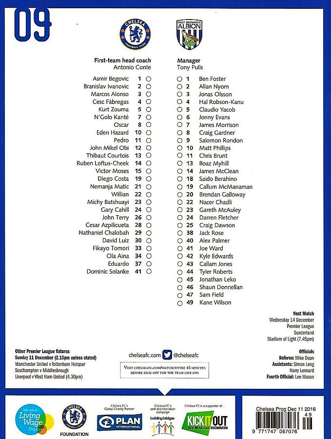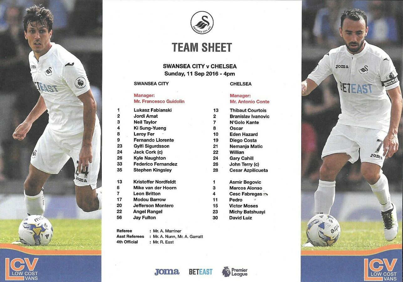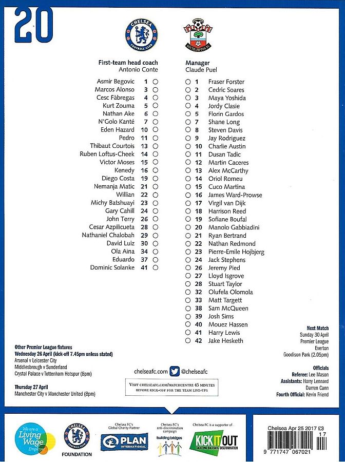 1 Asmir Begovic, 2 Branislav Ivanovic, 4 Cesc Fabregas, 11 Pedro (10 Eden Hazard 73), 14 Ruben Loftus-Cheek ( 8 Oscar 81), 15 Victor Moses, 21 Nemanja Matic, 23 Michy Batshuayi, 24 Gary Cahill, 28 Cesar Azpilicueta, 34 Ola Aina (26 John Terry 76) |