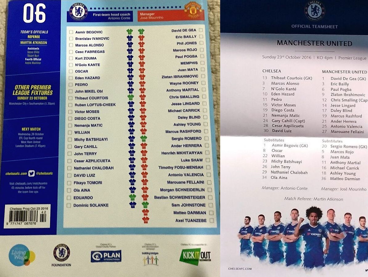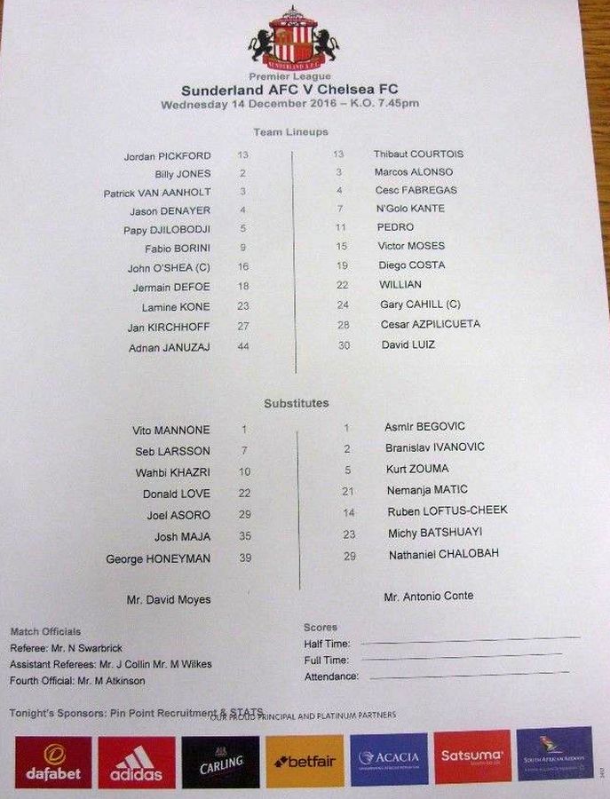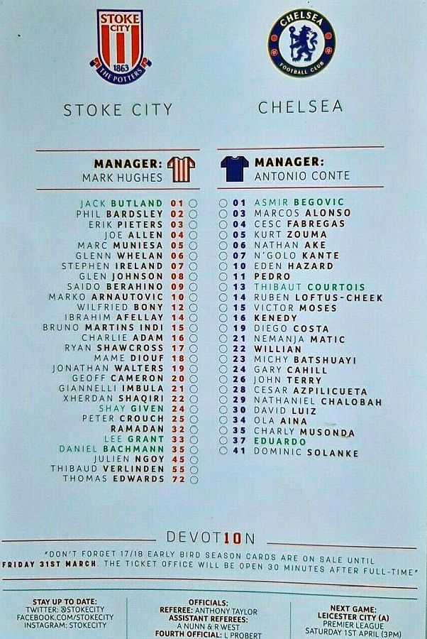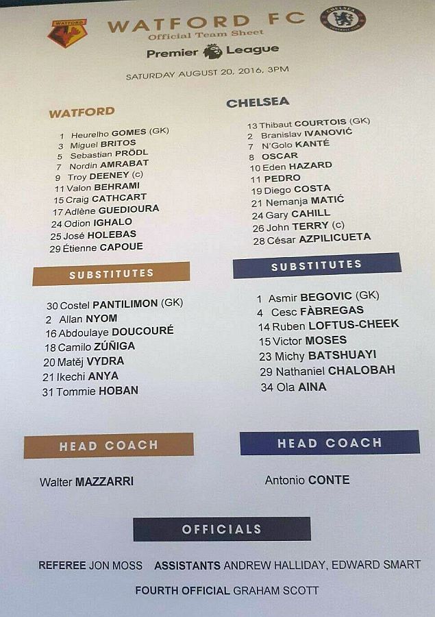 13 Thibaut Courtois, 3 Marcos Alonso, 7 N'Golo Kante, 10 Eden Hazard (22 Willian 85), 11 Pedro ( 4 Cesc Fabregas 82), 15 Victor Moses, 19 Diego Costa, 21 Nemanja Matic, 24 Gary Cahill, 28 Cesar Azpilicueta, 30 David Luiz ( 6 Nat Ake 82) |