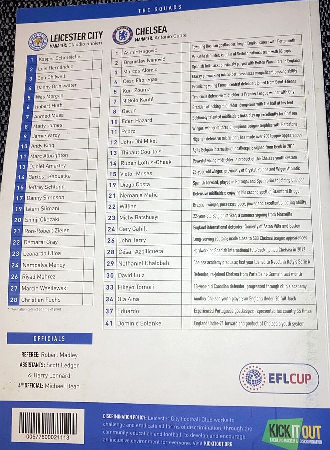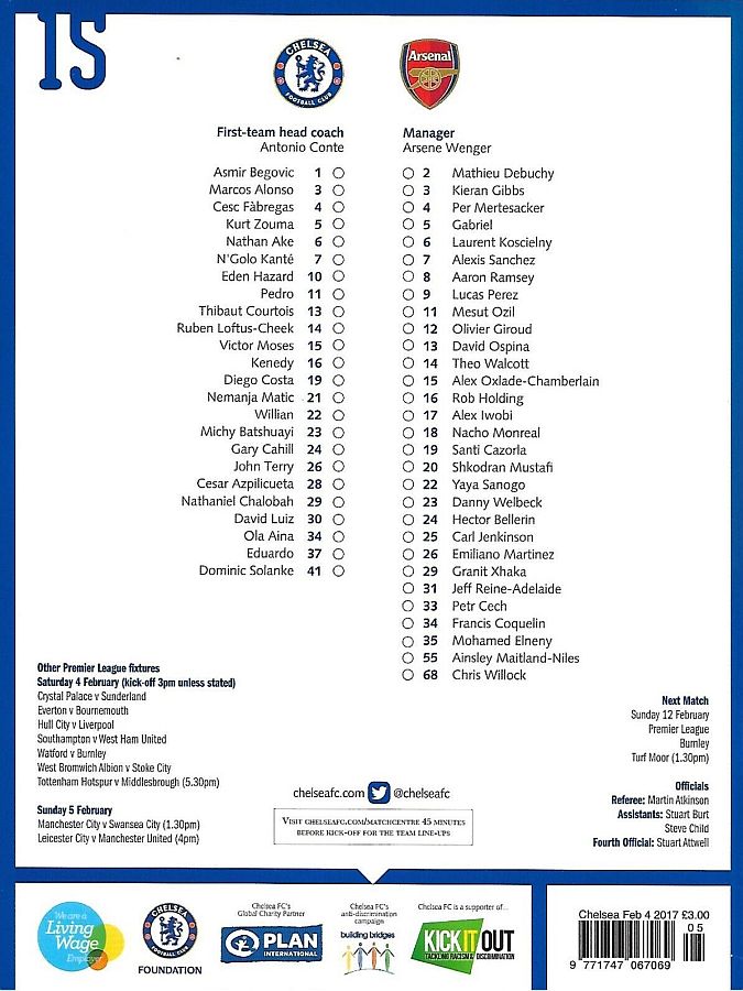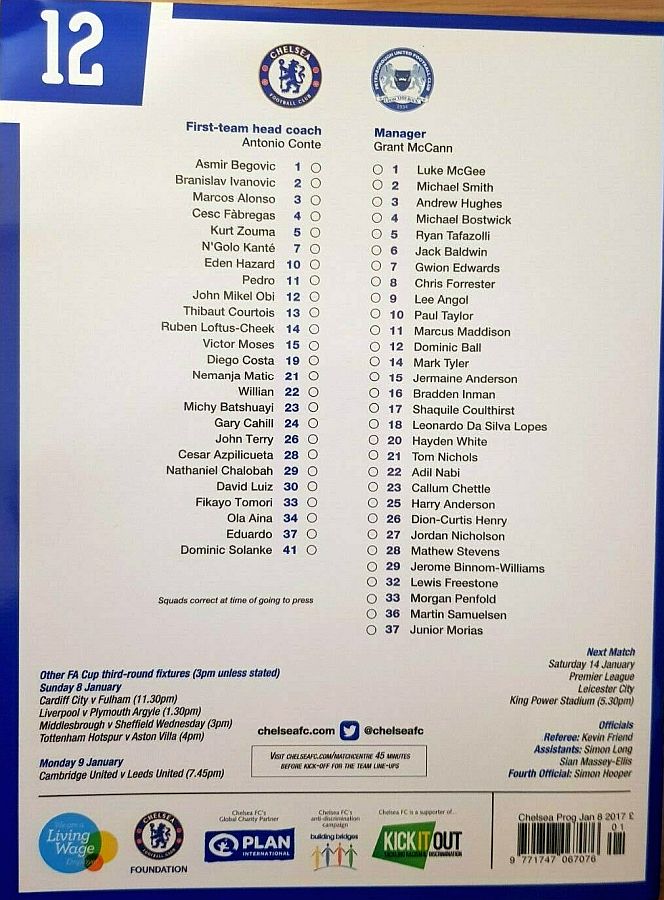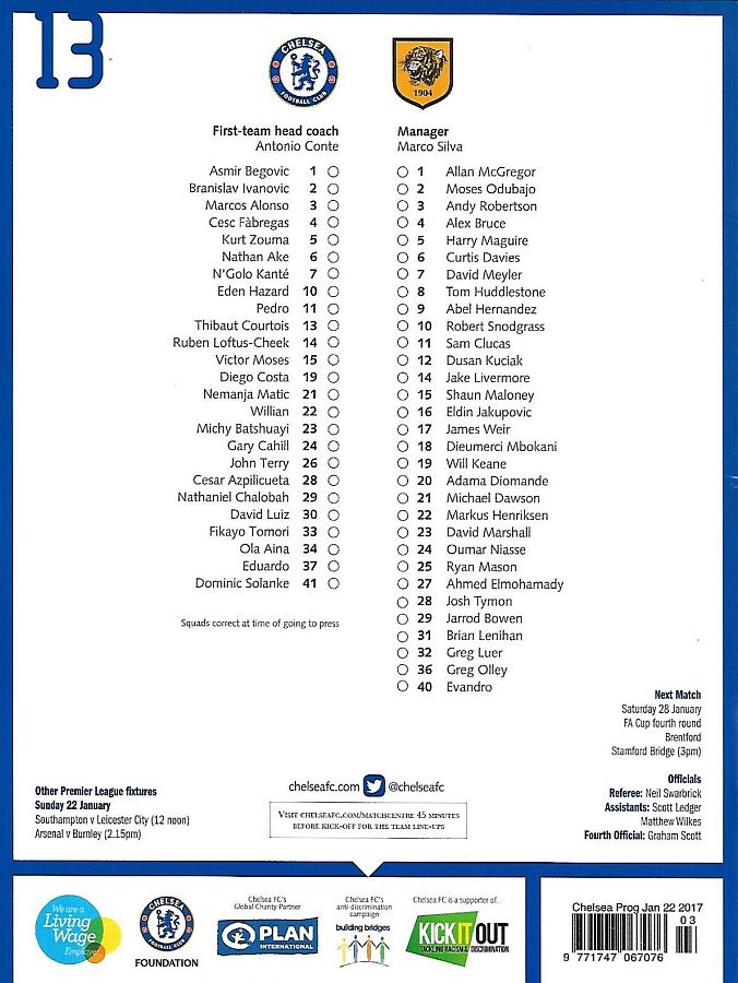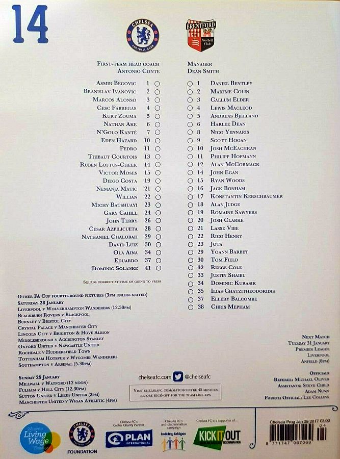 1 Asmir Begovic, 5 Kurt Zouma, 6 Nat Ake, 7 N'Golo Kante, 10 Eden Hazard, 16 Kenedy (34 Ola Aina 75), 22 Willian, 23 Michy Batshuayi (11 Pedro 84), 26 John Terry, 28 Cesar Azpilicueta, 29 Nathaniel Chalobah ( 4 Cesc Fabregas 79) |