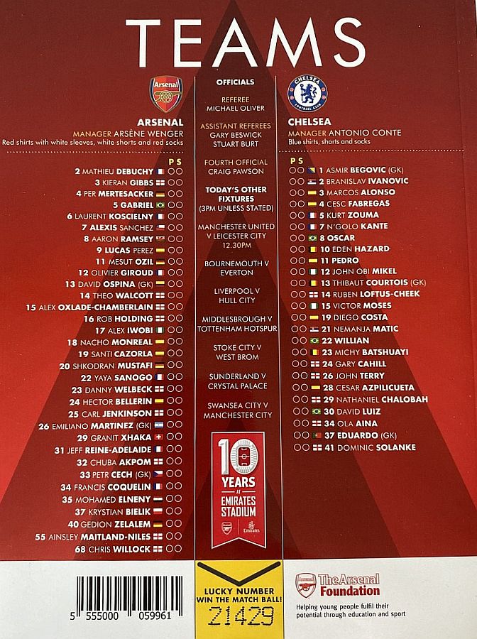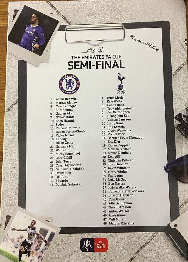 13 Thibaut Courtois, 3 Marcos Alonso, 4 Cesc Fabregas, 10 Eden Hazard (22 Willian 75), 11 Pedro (23 Michy Batshuayi 75), 15 Victor Moses ( 5 Kurt Zouma 86), 19 Diego Costa, 21 Nemanja Matic, 24 Gary Cahill, 28 Cesar Azpilicueta, 30 David Luiz |