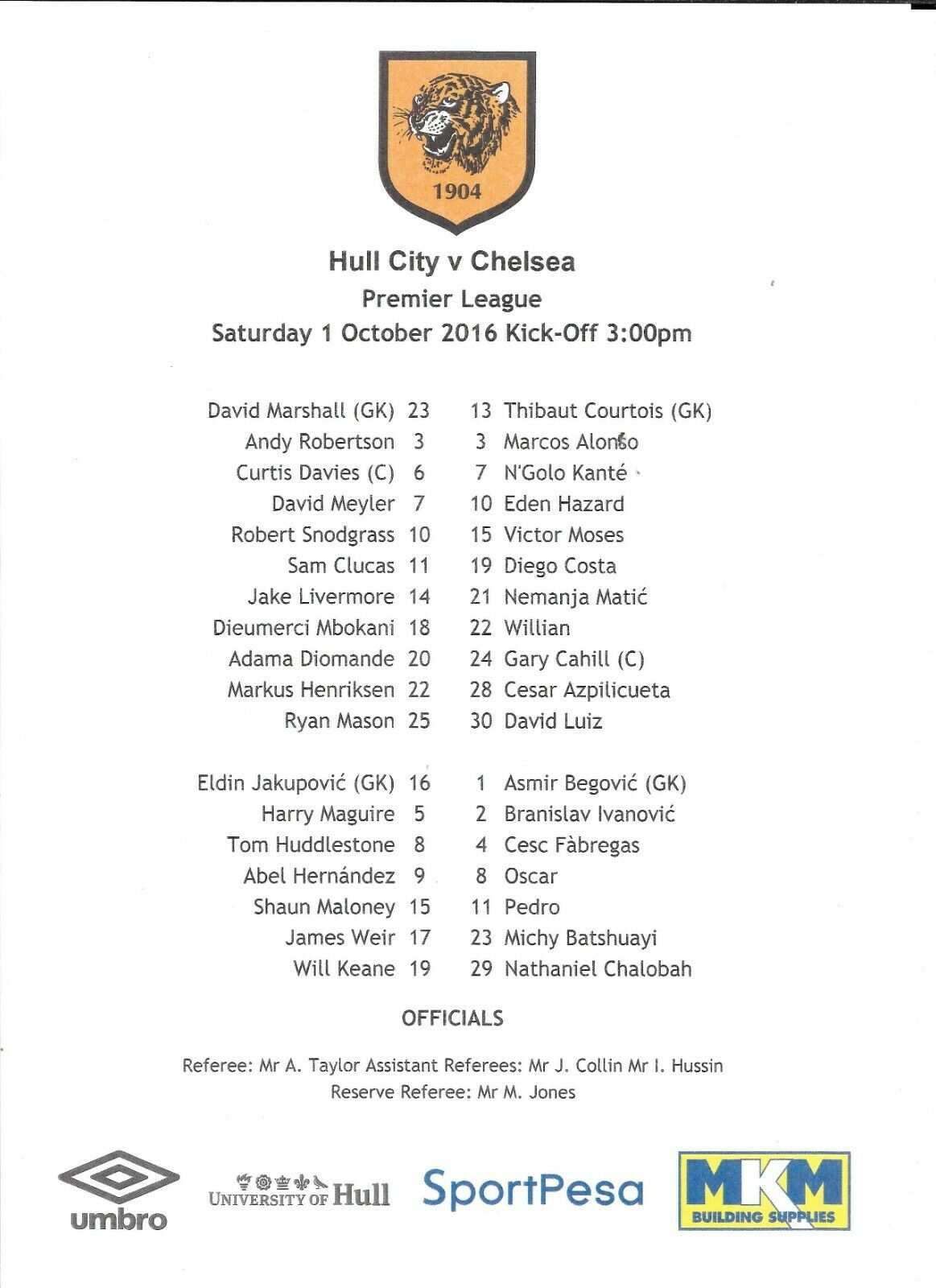 13 Thibaut Courtois, 2 Branislav Ivanovic, 7 N'Golo Kante, 8 Oscar, 10 Eden Hazard (11 Pedro 81), 19 Diego Costa (23 Michy Batshuayi 80), 21 Nemanja Matic, 22 Willian (15 Victor Moses 77), 24 Gary Cahill, 26 John Terry, 28 Cesar Azpilicueta |