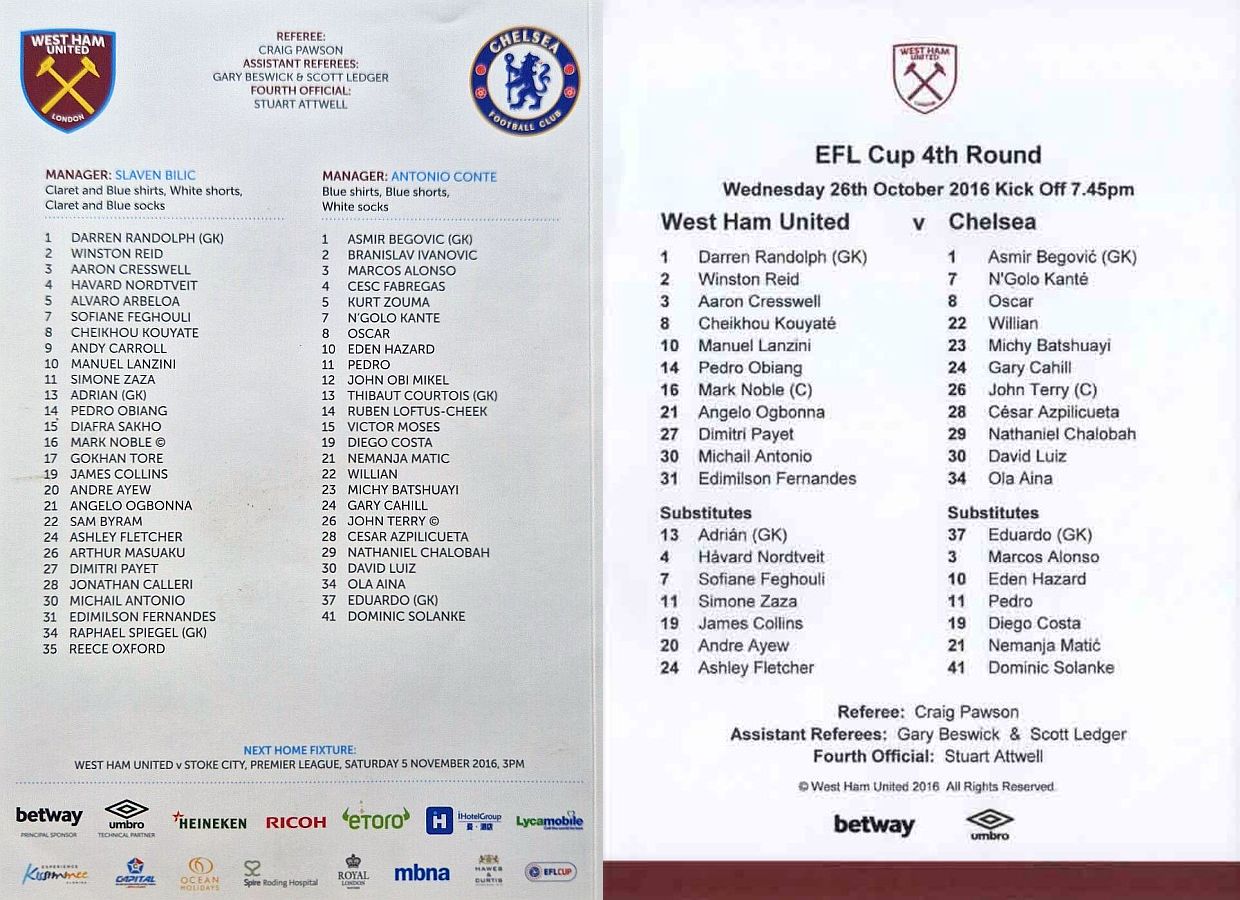 Adrian, Michail Antonio (Sam Byram 52), Winston Reid, James M Collins, Arthur Masuaku, Cheikhou Kouyate, Havard Nordtveit (Dimitri Payet 67), Mark Noble, Andre Ayew (Gokhan Tore 35), Andy Carroll, Enner Valencia |