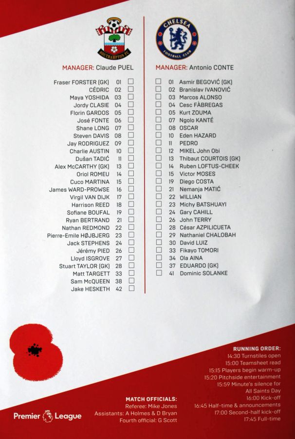 1 Asmir Begovic, 5 Kurt Zouma (14 Ruben Loftus-Cheek 83), 7 N'Golo Kante, 10 Eden Hazard, 11 Pedro, 15 Victor Moses ( 4 Cesc Fabregas 54), 19 Diego Costa, 21 Nemanja Matic (22 Willian 66), 24 Gary Cahill, 28 Cesar Azpilicueta, 30 David Luiz |