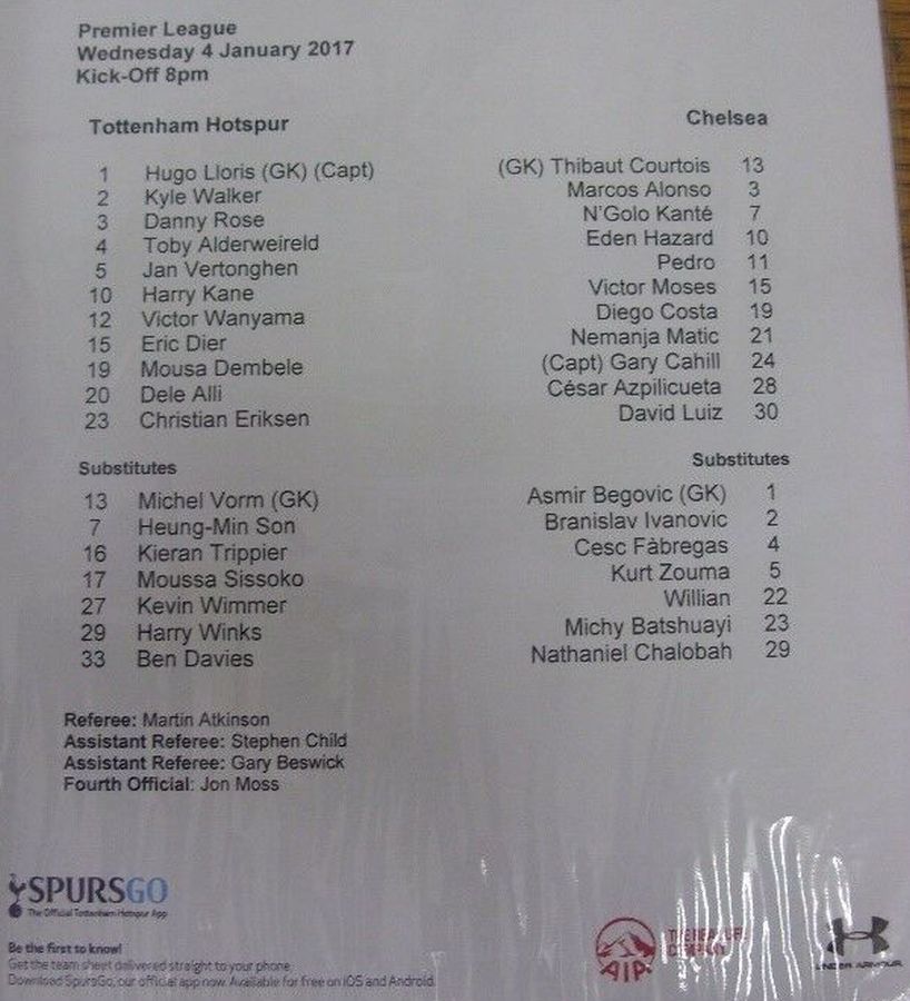 Hugo Lloris, Kieran Trippier, Eric Dier, Toby Alderweireld, Jan Vertonghen, Victor Wanyama (Georges-Kevin N'Koudou 80), Moussa Dembele, Heung-min Son (Kyle Walker 68), Christian Eriksen, Dele Alli, Harry Kane |