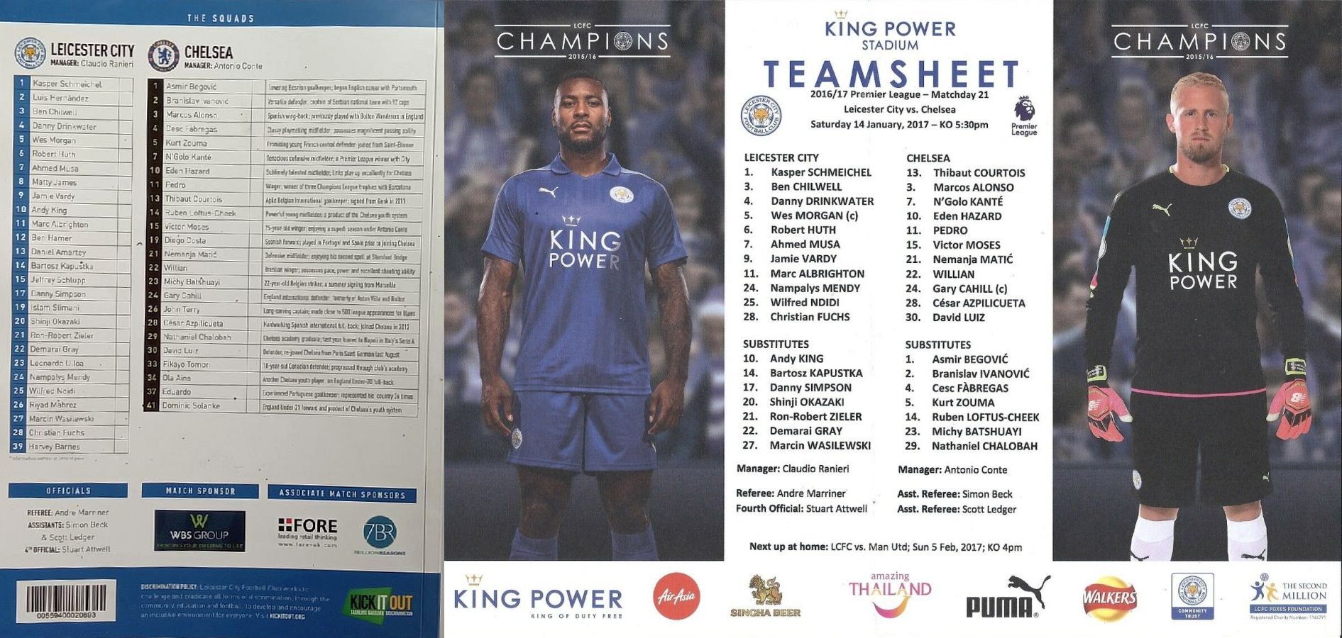 13 Thibaut Courtois, 3 Marcos Alonso, 6 Nat Ake, 7 N'Golo Kante, 11 Pedro ( 4 Cesc Fabregas 74), 15 Victor Moses, 21 Nemanja Matic, 22 Willian (10 Eden Hazard 61), 23 Michy Batshuayi (19 Diego Costa 61), 28 Cesar Azpilicueta, 30 David Luiz |