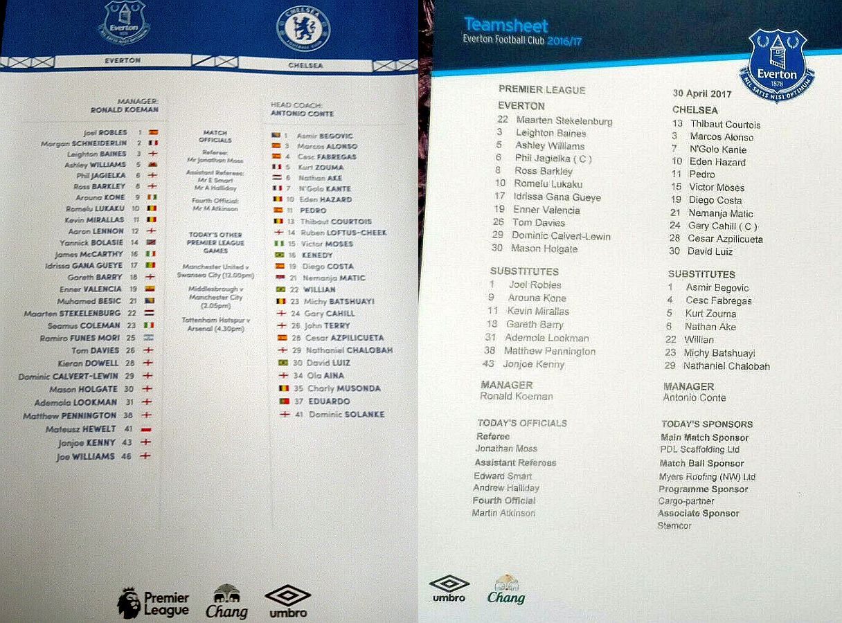 Maarten Stekelenburg, Mason Holgate, Ashley Williams, Phil Jagielka, Dominic Calvert-Lewin (Kevin Mirallas 72), Leighton Baines, Idrissa Gueye, Tom Davies, Ross Barkley, Enner Valencia (Arouna Kone 72), Romelu Lukaku |
