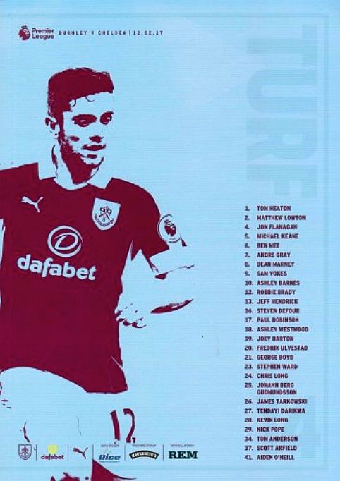 Tom Heaton, Matt Lowton, Michael Keane, Ben Mee, Stephen Ward, George Boyd, Dean Marney (James Tarkowski 72), Steven Defour (Aiden O'Neill 57), Scott Arfield (Johann Berg Gudmundsson 57), Andre Gray, Sam Vokes |