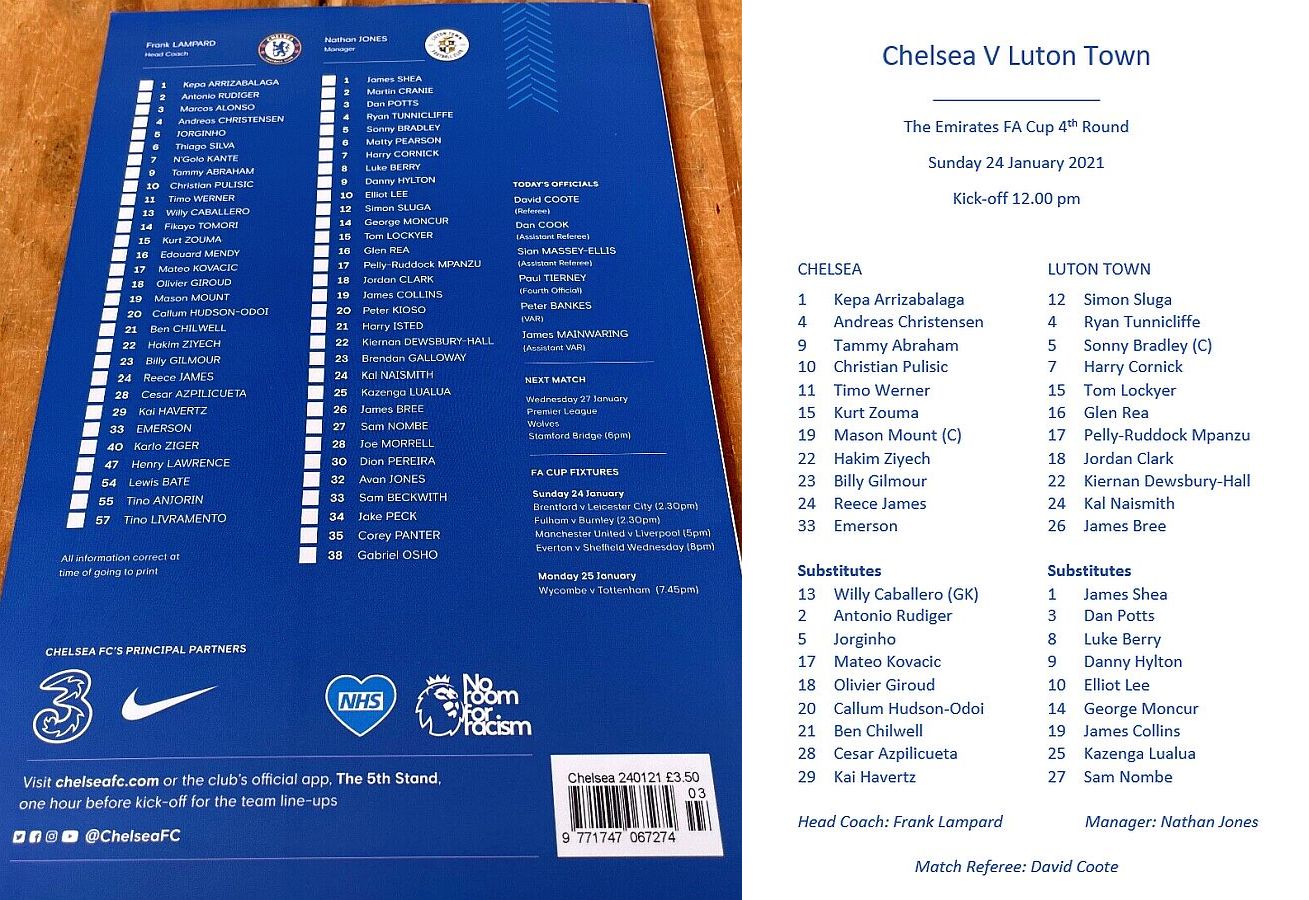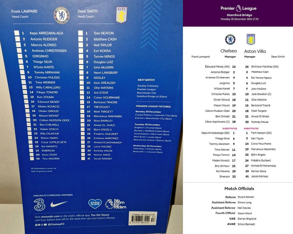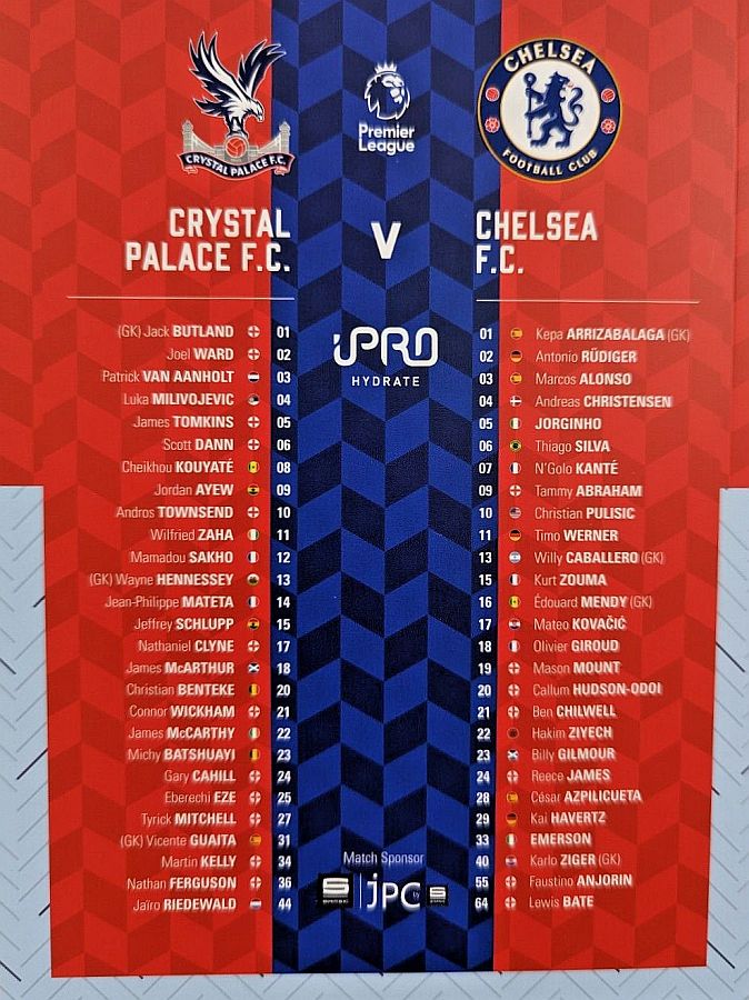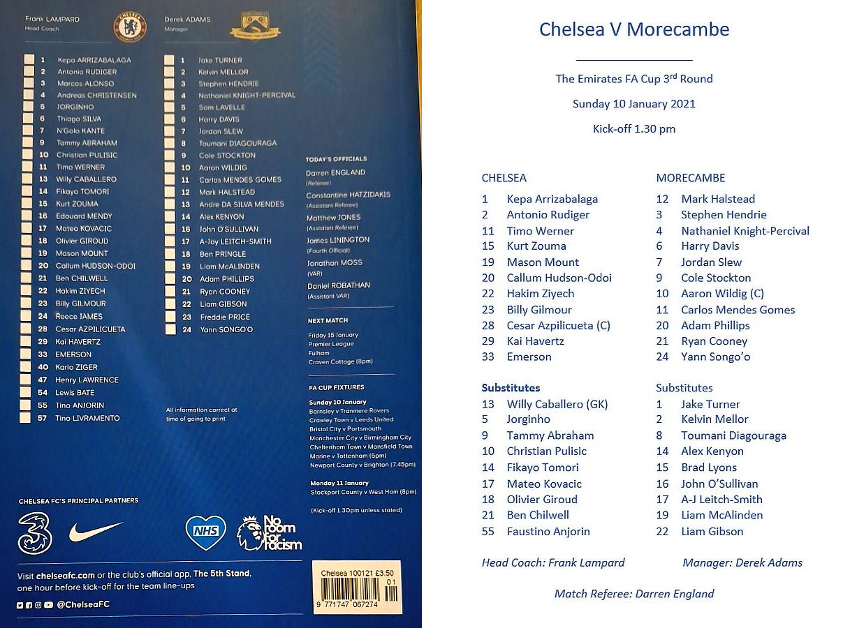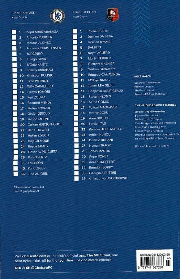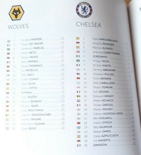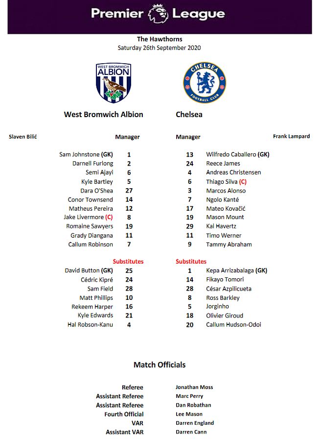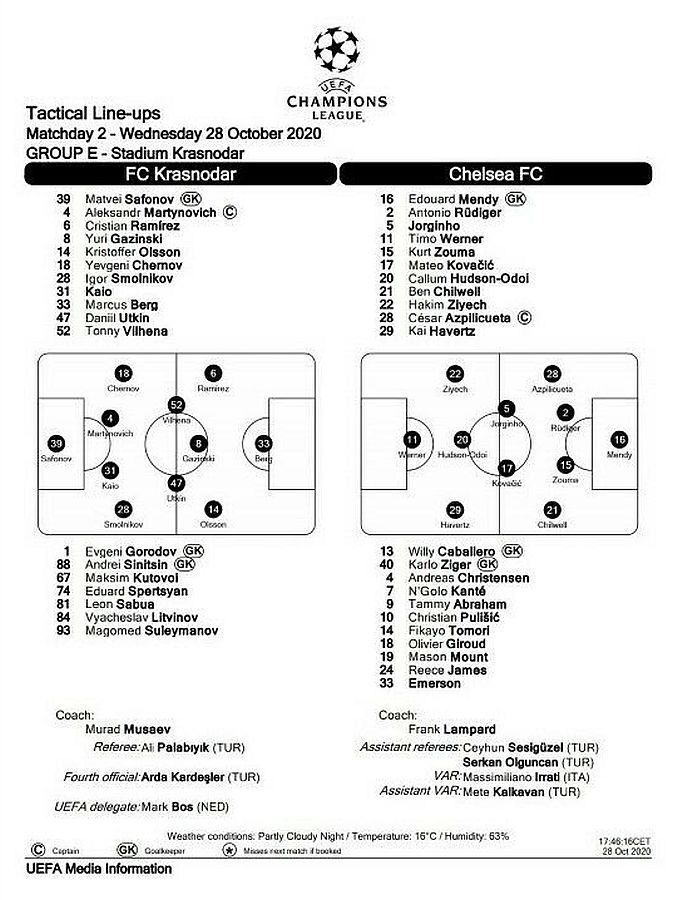 13 Willy Caballero, 6 Thiago Silva (15 Kurt Zouma 61), 8 Ross Barkley, 9 Tammy Abraham (18 Olivier Giroud 72), 14 Fikayo Tomori, 17 Mateo Kovacic, 19 Mason Mount, 20 Callum Hudson-Odoi, 28 Cesar Azpilicueta, 29 Kai Havertz (21 Ben Chilwell 66), 33 Emerson |