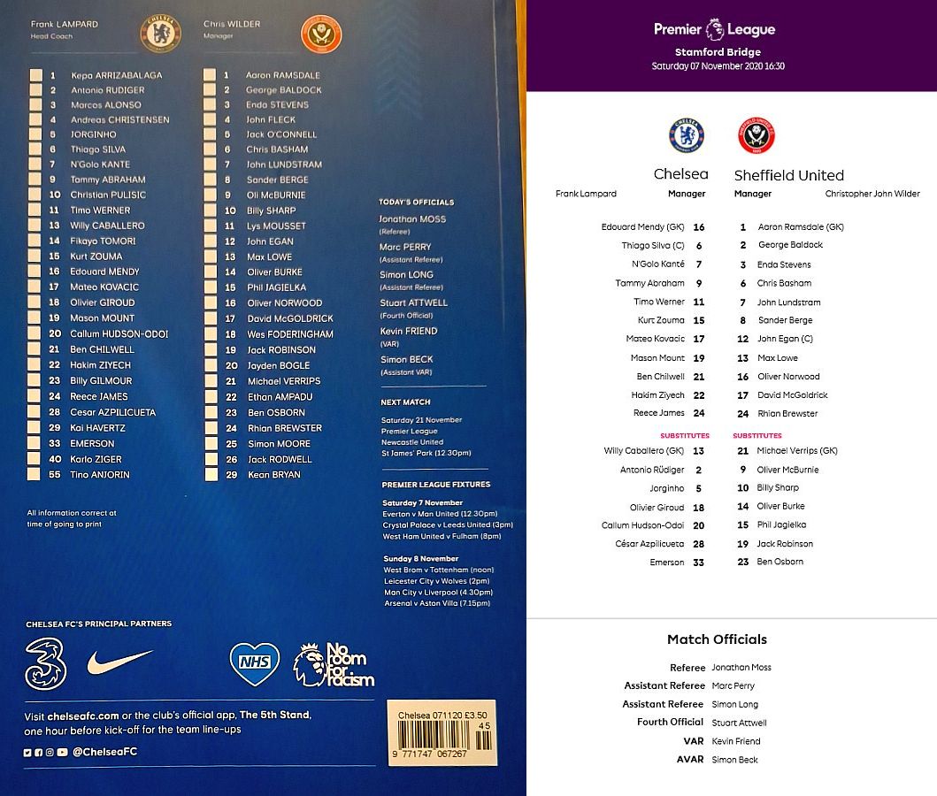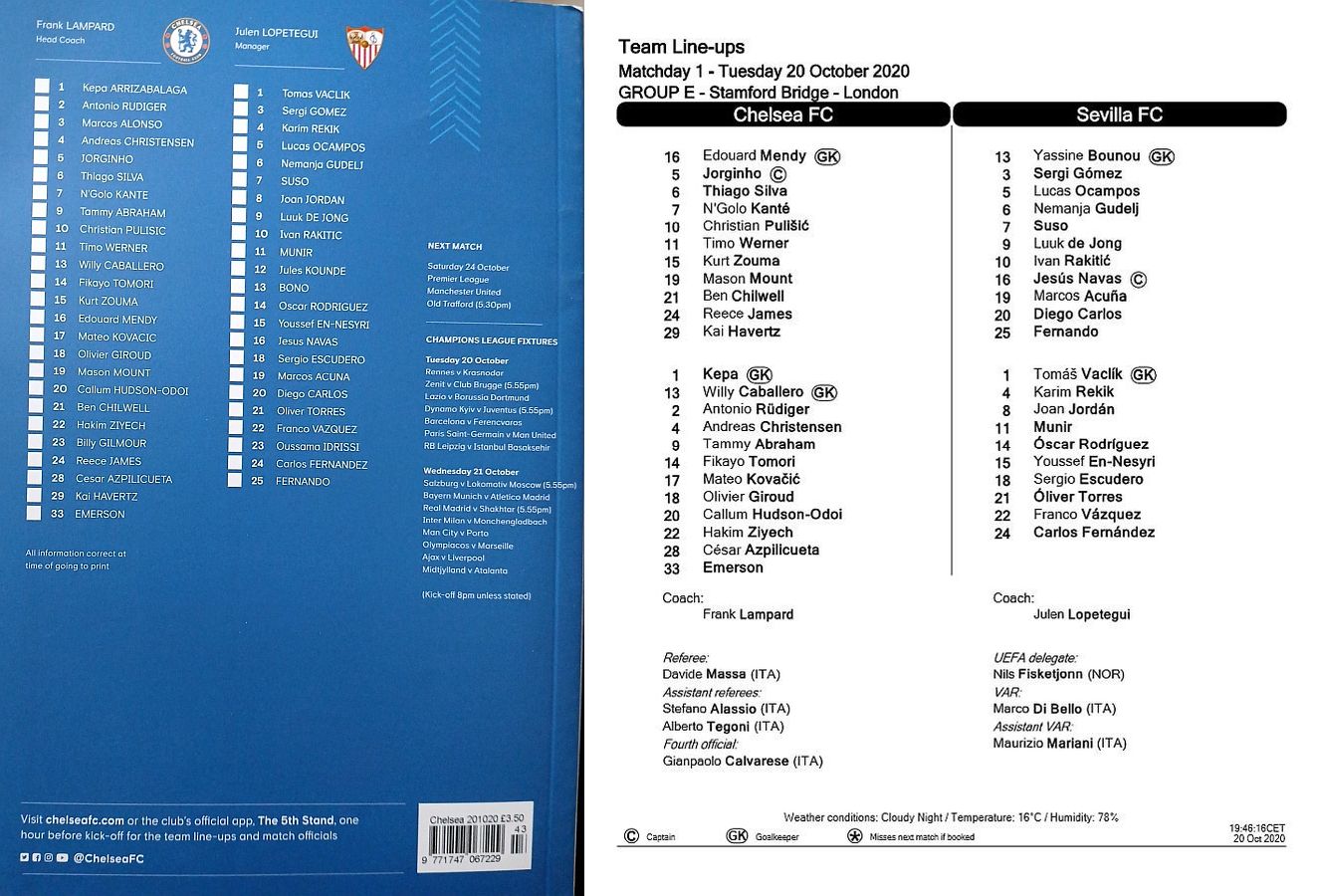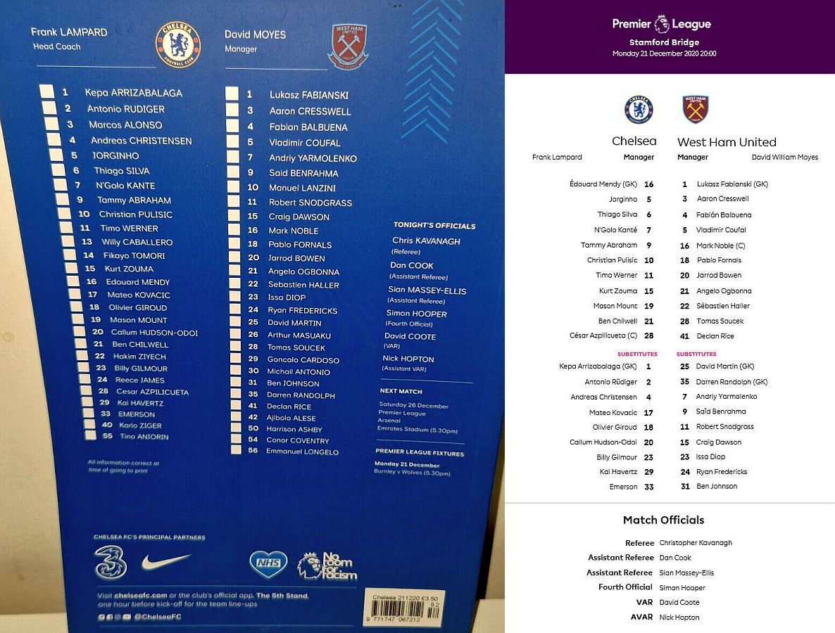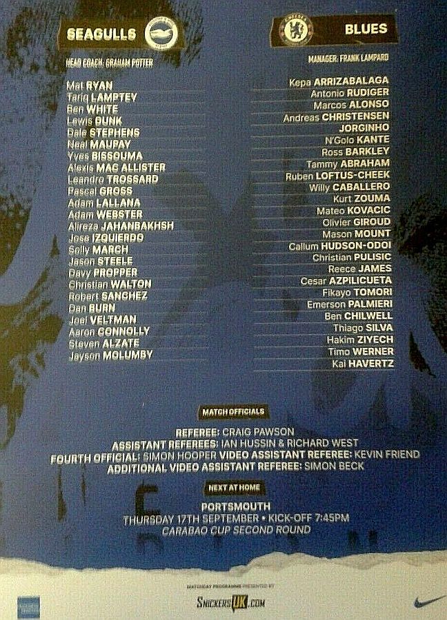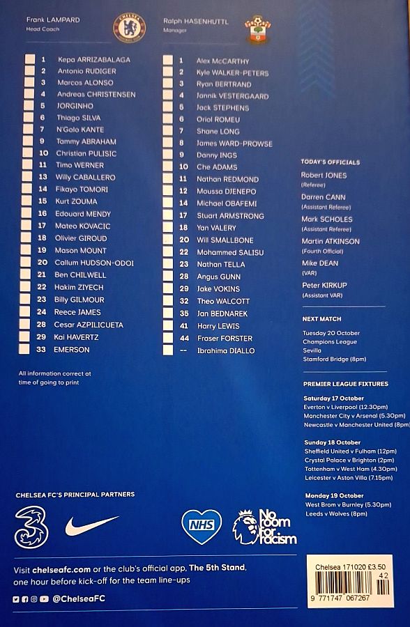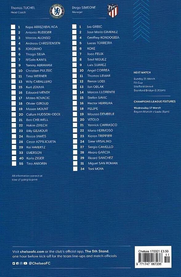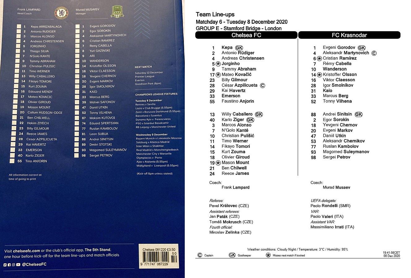 13 Willy Caballero, 6 Thiago Silva (15 Kurt Zouma 61), 8 Ross Barkley, 9 Tammy Abraham (18 Olivier Giroud 72), 14 Fikayo Tomori, 17 Mateo Kovacic, 19 Mason Mount, 20 Callum Hudson-Odoi, 28 Cesar Azpilicueta, 29 Kai Havertz (21 Ben Chilwell 66), 33 Emerson |