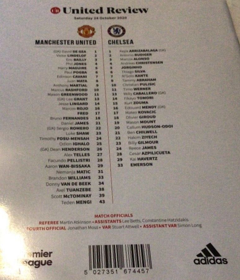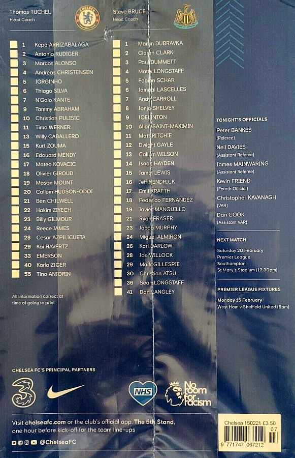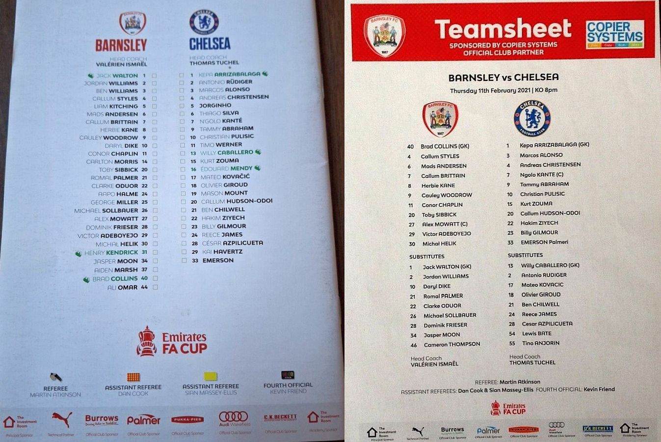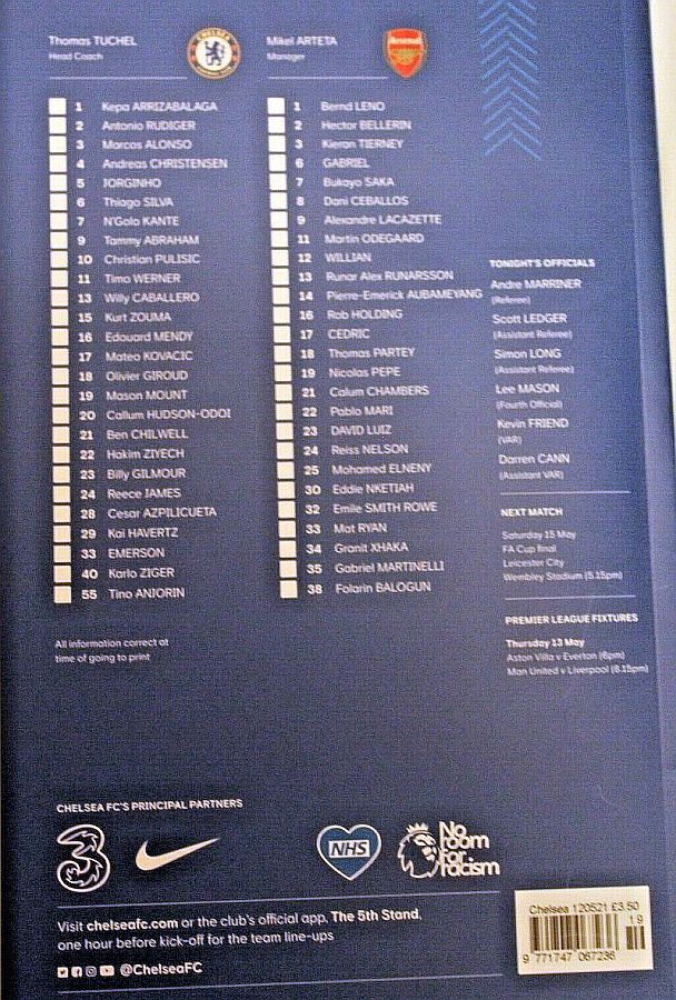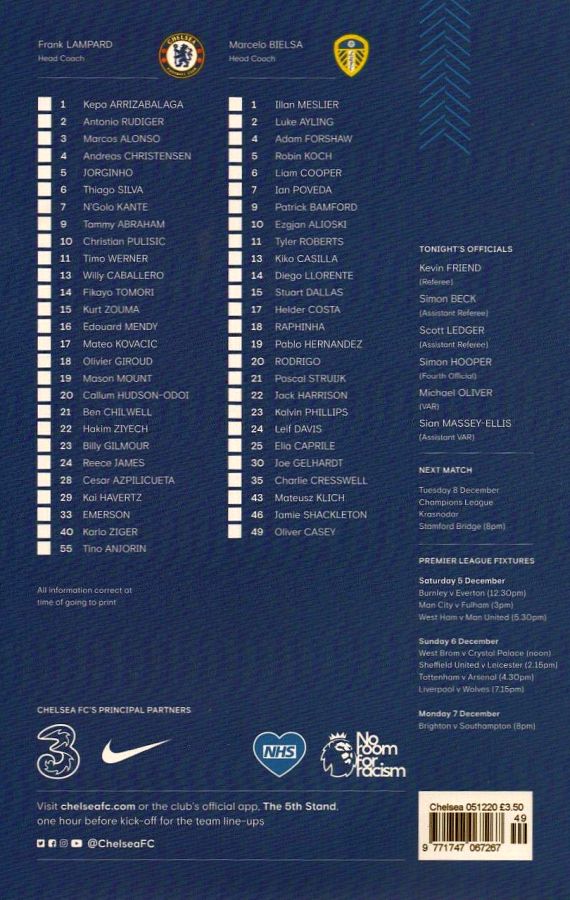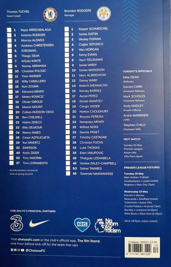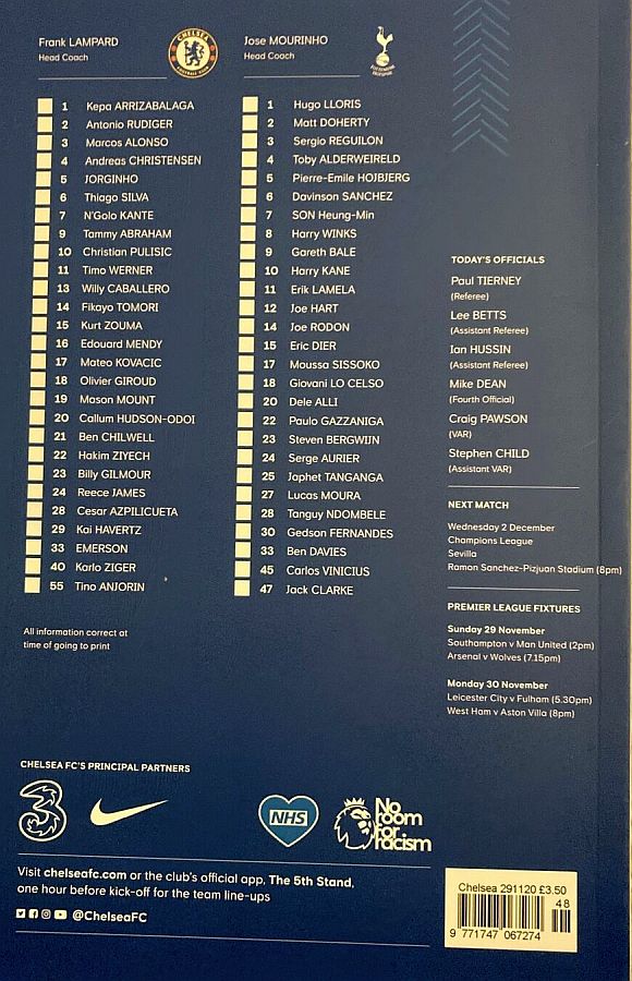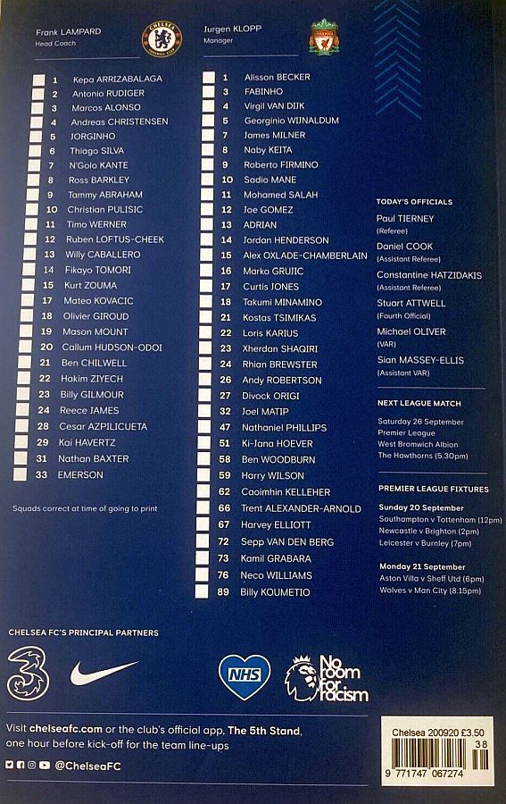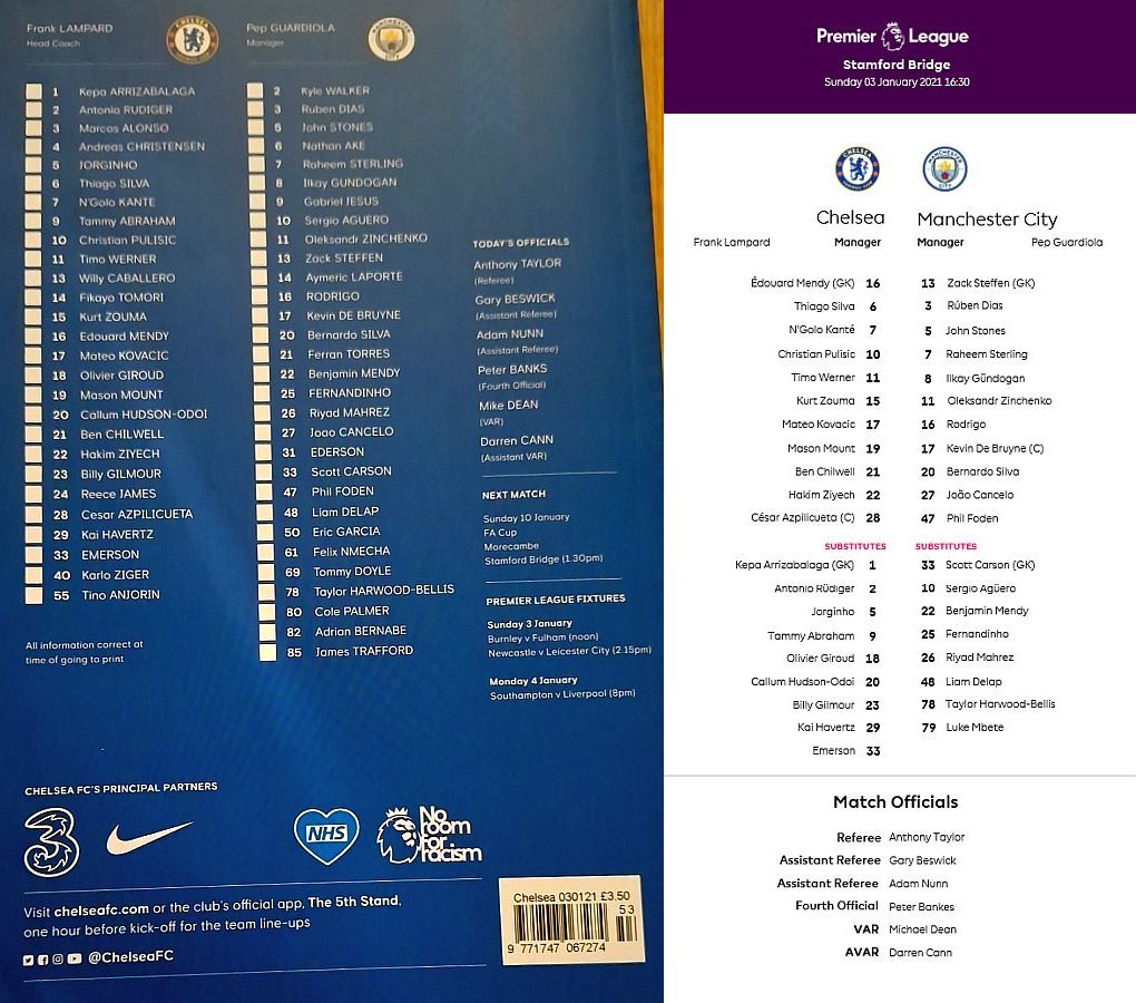 13 Willy Caballero, 6 Thiago Silva (15 Kurt Zouma 61), 8 Ross Barkley, 9 Tammy Abraham (18 Olivier Giroud 72), 14 Fikayo Tomori, 17 Mateo Kovacic, 19 Mason Mount, 20 Callum Hudson-Odoi, 28 Cesar Azpilicueta, 29 Kai Havertz (21 Ben Chilwell 66), 33 Emerson |