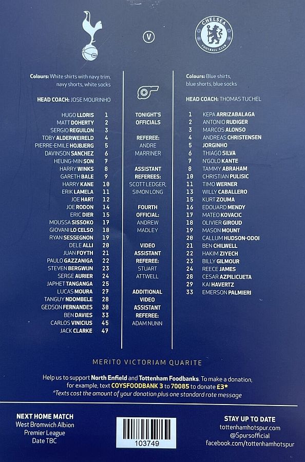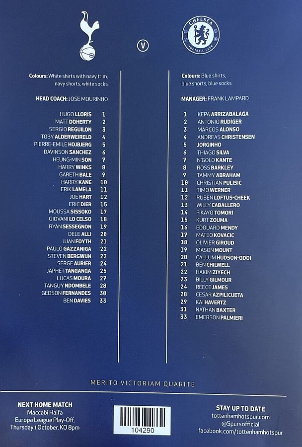 Hugo Lloris, Serge Aurier, Toby Alderweireld, Eric Dier, Japhet Tanganga (Harry Kane 70), Sergio Reguilon, Moussa Sissoko, Gedson Fernandes (Pierre-Emile Hojbjerg 63), Tanguy Ndombele, Erik Lamela, Steven Bergwijn (Lucas Moura 70) |