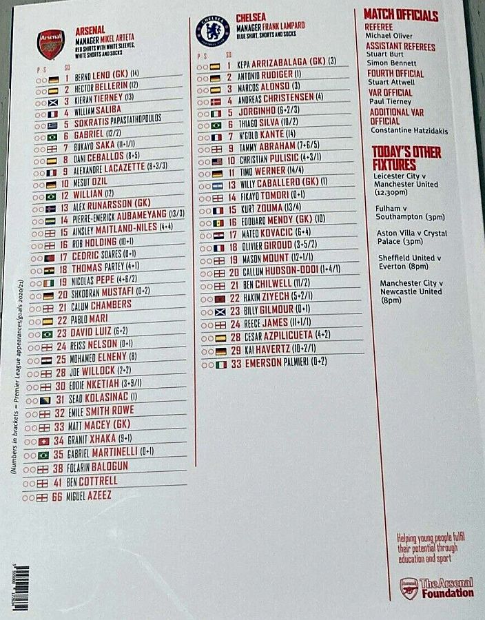 Bernd Leno, Rob Holding, Gabriel, Pablo Mari, Marc Tierney, Mohamed Elneny, Thomas Partey, Bukayo Saka (Hector Bellerin 65) (Calum Chambers 88), Martin Odegaard, Emile Smith Rowe, Aubameyang (Alexandre Lacazette 79) |