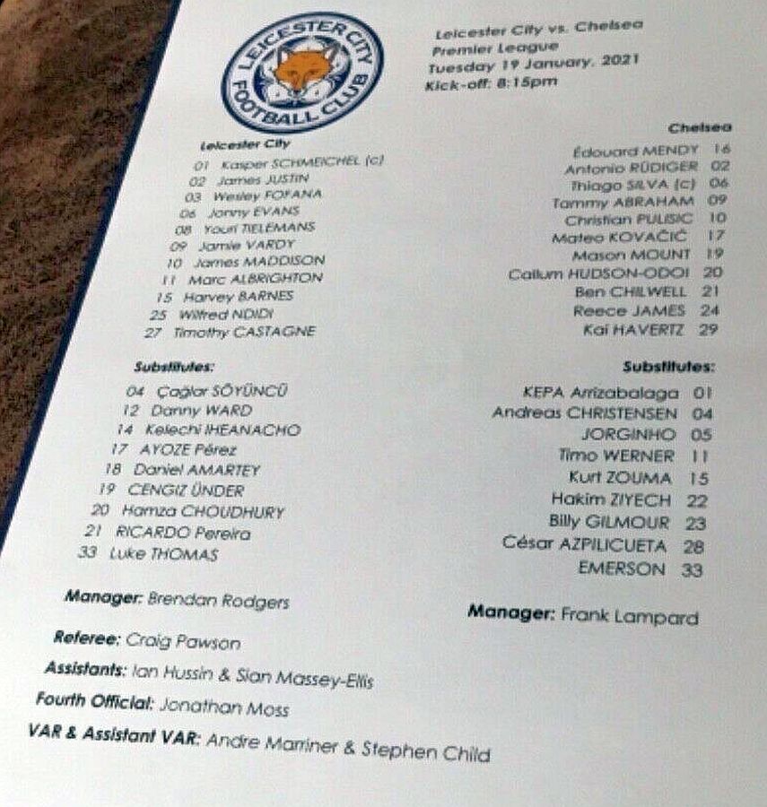 Kasper Schmeichel, Wesley Fofana, Jonny Evans (Marc Albrighton 34), Caglar Soyuncu, Timothy Castagne, Youri Tielemans, Wilfred Ndidi, Luke Thomas (Wes Morgan 82), Ayoze Perez (Hamza Choudhury 82), Kelechi Iheanacho (James Maddison 67), Jamie Vardy |