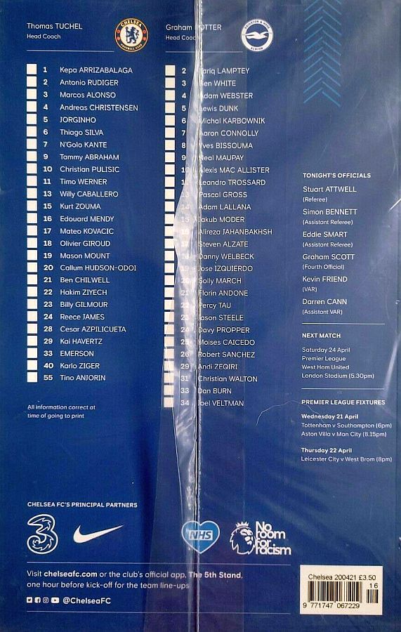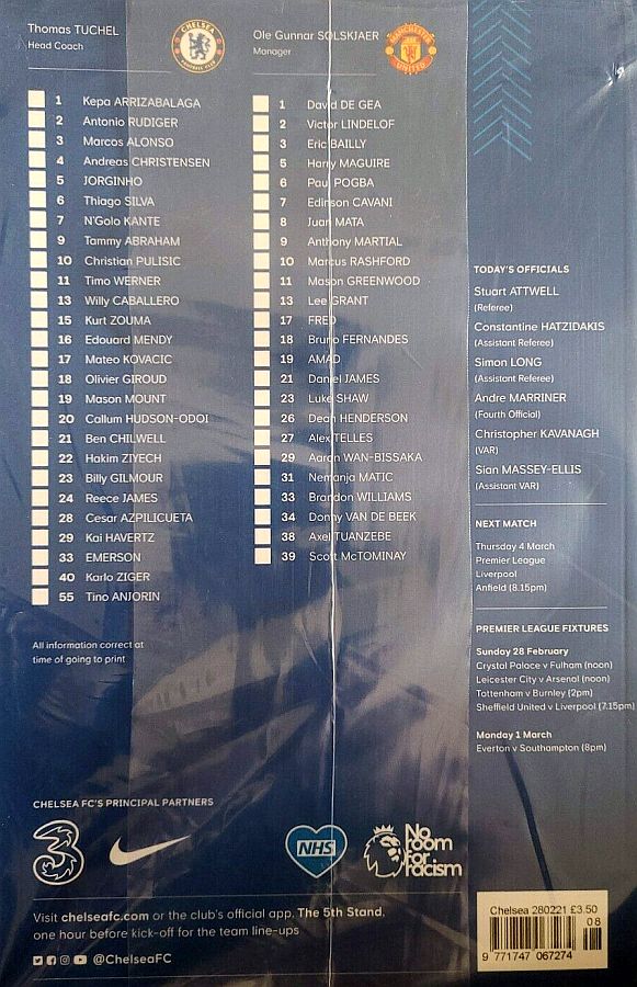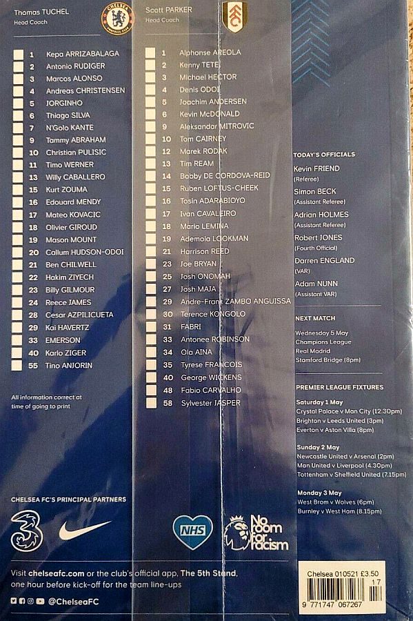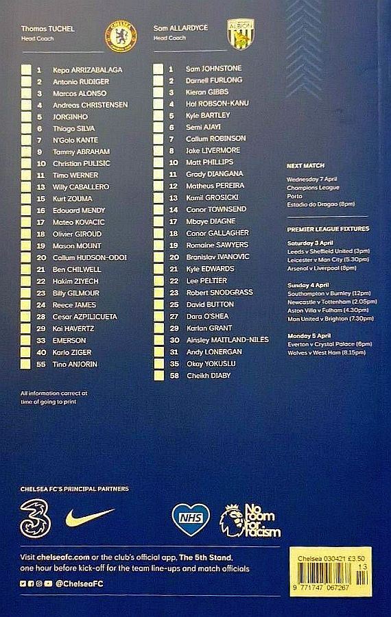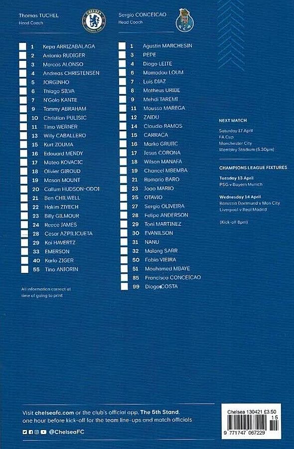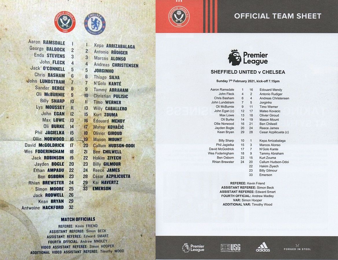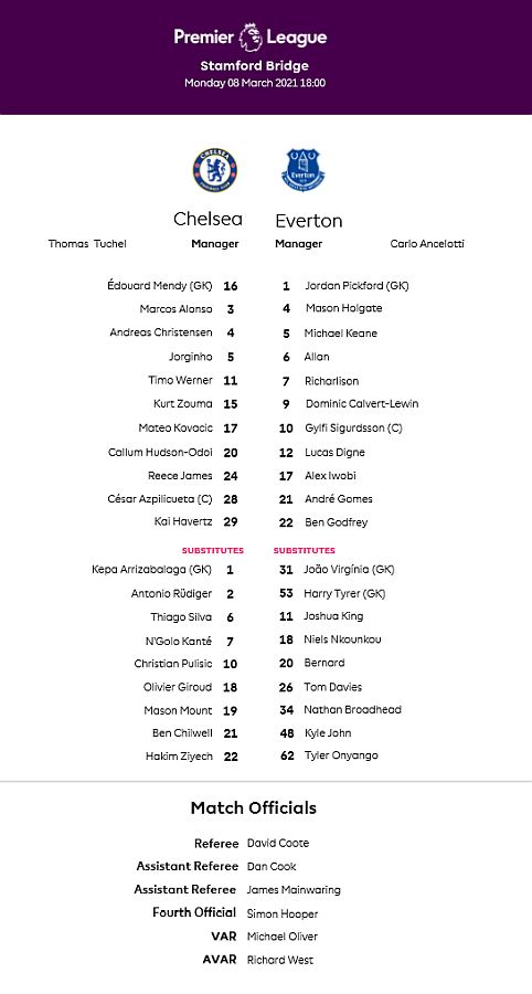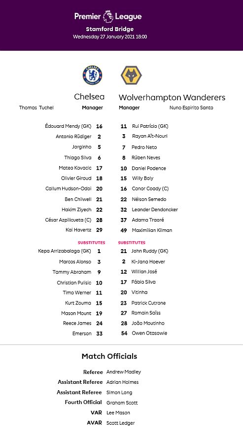 16 Edouard Mendy ( 1 Kepa 46), 2 Antonio Rudiger, 5 Jorginho (22 Hakim Ziyech 60), 6 Thiago Silva, 10 Christian Pulisic, 11 Timo Werner, 17 Mateo Kovacic (29 Kai Havertz 66), 19 Mason Mount, 21 Ben Chilwell, 24 Reece James, 28 Cesar Azpilicueta |