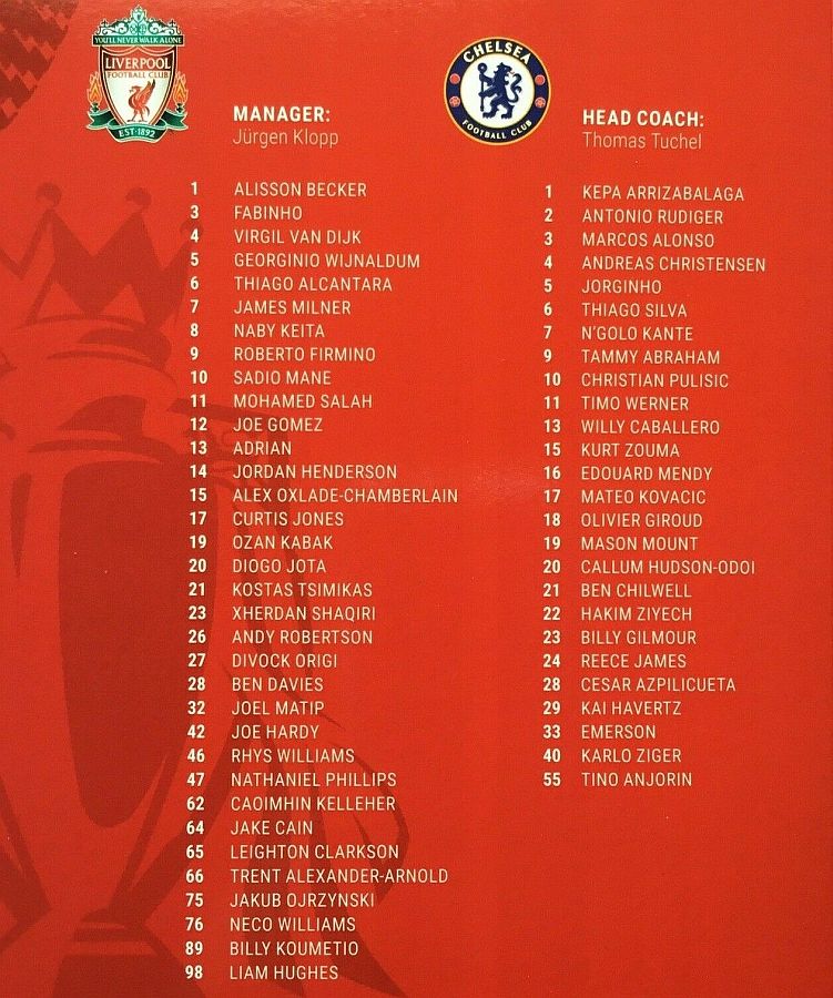 Alisson Becker, Trent Alexander-Arnold, Virgil Van Dijk, Fabinho, Andy Robertson, Naby Keita (James Milner 64), Jordan Henderson (Thiago 46), Georginio Wijnaldum, Mohamed Salah, Roberto Firmino (Takumi Minamino 86), Sadio Mane |