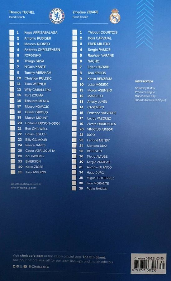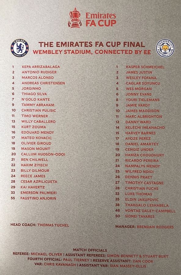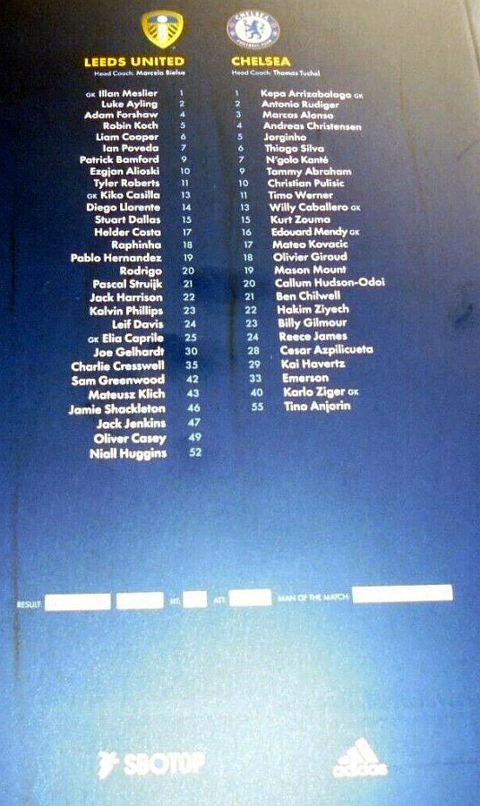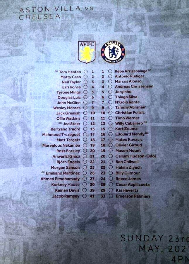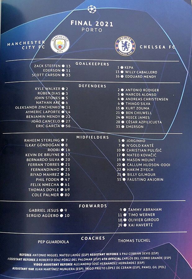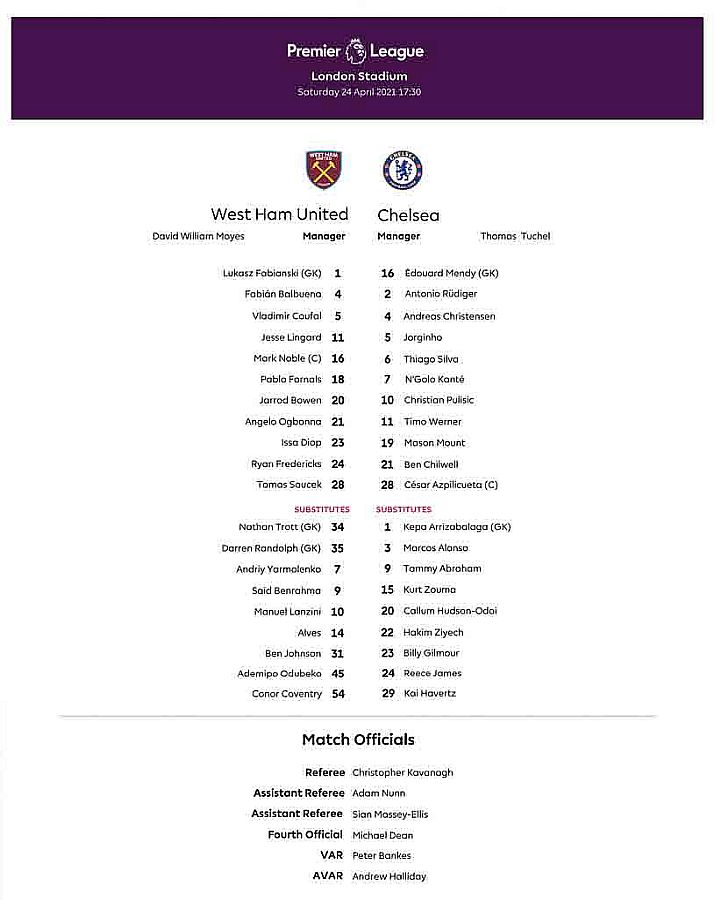 16 Edouard Mendy, 2 Antonio Rudiger, 5 Jorginho, 6 Thiago Silva ( 4 Andreas Christensen 39), 7 N'Golo Kante, 11 Timo Werner (10 Christian Pulisic 66), 19 Mason Mount (17 Mateo Kovacic 80), 21 Ben Chilwell, 24 Reece James, 28 Cesar Azpilicueta, 29 Kai Havertz |
