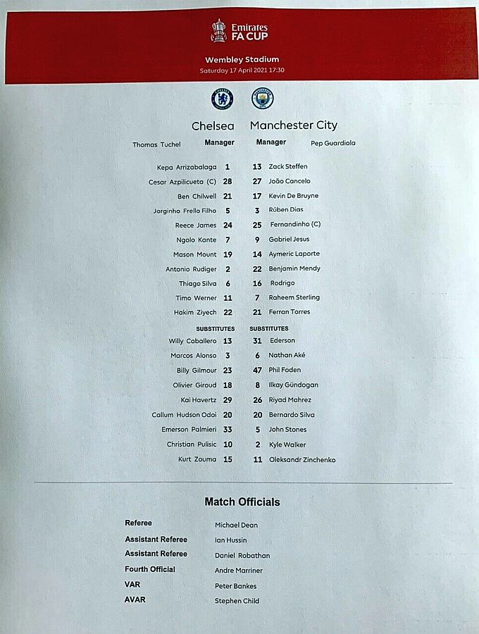 16 Edouard Mendy, 2 Antonio Rudiger, 5 Jorginho, 6 Thiago Silva, 7 N'Golo Kante (17 Mateo Kovacic 32), 10 Christian Pulisic, 11 Timo Werner (18 Olivier Giroud 90), 19 Mason Mount, 21 Ben Chilwell, 24 Reece James, 28 Cesar Azpilicueta (15 Kurt Zouma 88) |