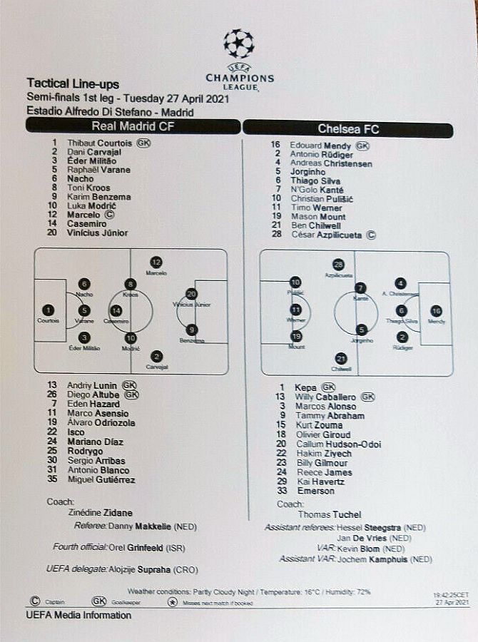 Thibaut Courtois, Nacho Fernandez, Eder Militao, Sergio Ramos, Ferland Mendy (Federico Valverde 63), Luka Modric, Casemiro (Rodrygo 76), Toni Kroos, Vinicius (Marco Asensio 63), Karim Benzema, Eden Hazard (Mariano Diaz 89) |