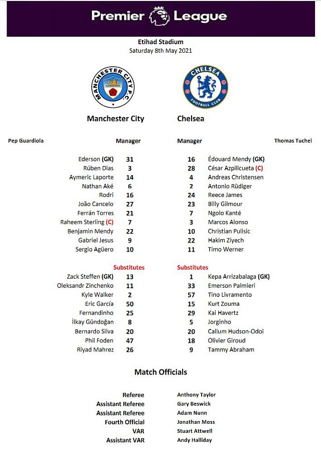 Ederson, Kyle Walker, John Stones, Ruben Dias, Olexsandr Zinchenko, Kevin De Bruyne (Gabriel Jesus 60), Ilkay Gundogan, Bernardo Silva (Fernandinho 64), Riyad Mahrez, Raheem Sterling (Sergio Aguero 77), Phil Foden |