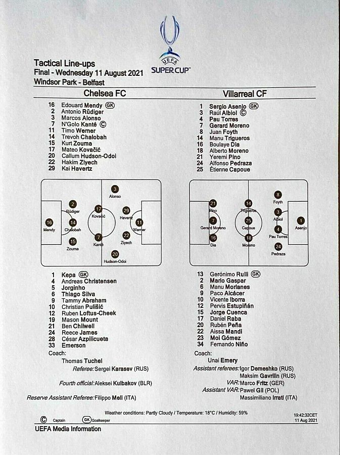 16 Edouard Mendy ( 1 Kepa 119), 2 Antonio Rudiger, 3 Marcos Alonso, 7 N'Golo Kante ( 5 Jorginho 65), 17 Mateo Kovacic, 11 Timo Werner (19 Mason Mount 65), 14 Trevoh Chalobah, 15 Kurt Zouma ( 4 Andreas Christensen 66), 20 Callum Hudson-Odoi (28 Cesar Azpilicueta 82), 22 Hakim Ziyech (10 Christian Pulisic 43), 29 Kai Havertz |