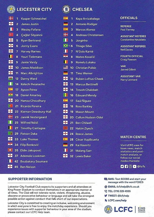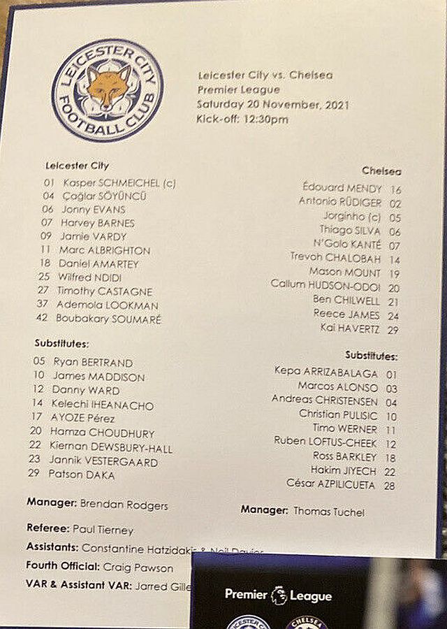 Kasper Schmeichel, Timothy Castagne, Wesley Fofana, Jonny Evans, Luke Thomas, Nampalys Mendy, James Maddison, Daniel Amartey, Kiernan Dewsbury-Hall, Kelechi Iheanacho (Harvey Barnes 63), Jamie Vardy (Ayoze Perez 78) |