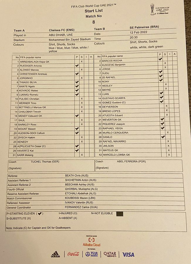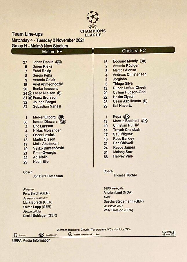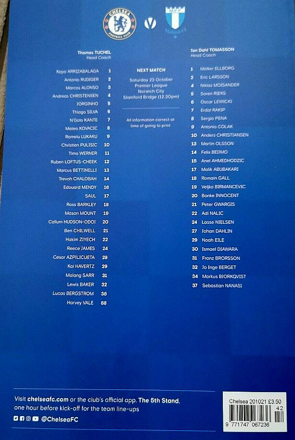16 Edouard Mendy, 2 Antonio Rudiger, 3 Marcos Alonso (17 Saul Niguez 46), 6 Thiago Silva, 8 Mateo Kovacic, 9 Romelu Lukaku (29 Kai Havertz 90), 10 Christian Pulisic, 11 Timo Werner, 12 Ruben Loftus-Cheek, 24 Reece James, 28 Cesar Azpilicueta (31 Malang Sarr 86) |