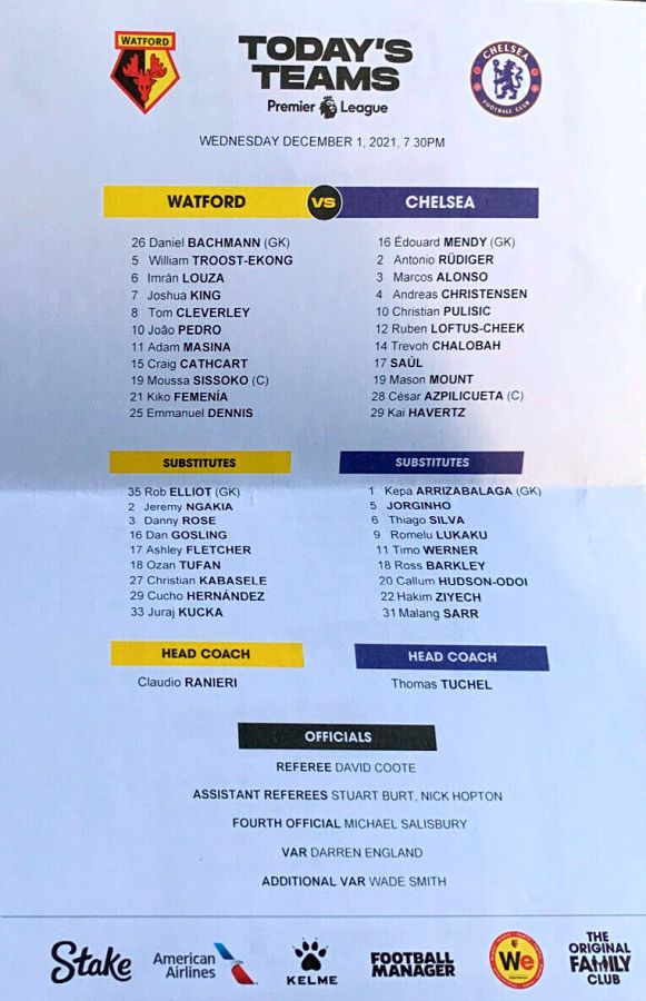 Dan Bachmann, Kiko Femenia, Christian Kabasele, Samir, Hassane Kamara (Adam Masina 78), Moussa Sissoko, Edo Kayembe (Dan Gosling 82), Tom Cleverley, Joao Pedro, Josh King (Cucho Hernandez 72), Ken Sema |