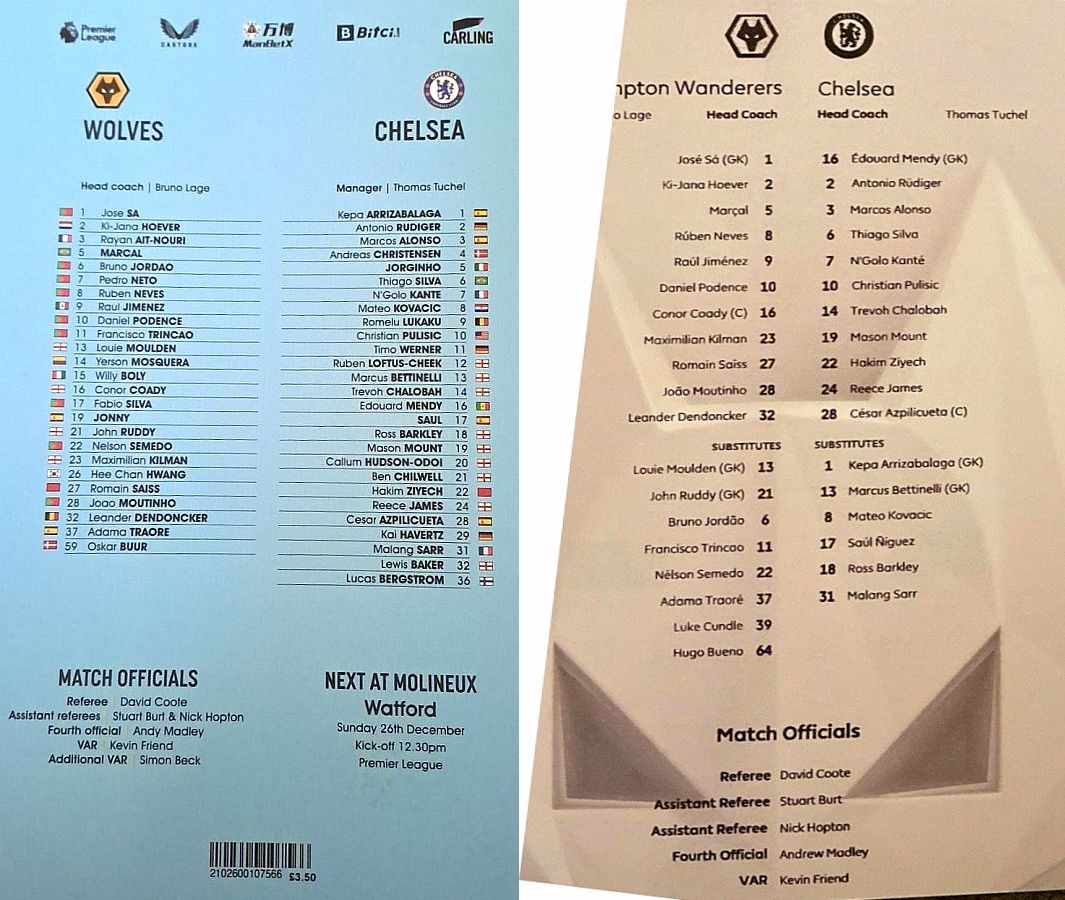 Jose Sa, Jonny, Willy Boly, Conor Coady, Romain Saiss (Chiquinho 71), Rayan Ait-Nouri, Leander Dendoncker, Ruben Neves (Trincao 76), Joao Moutinho, Raul Jimenez, Pedro Neto (Hwang 70) |