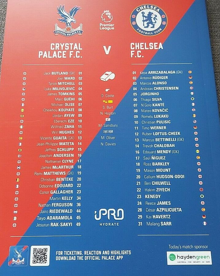 Vicente Guaita, Joel Ward, Marc Guehi, Cheikhou Kouyate, Tyrick Mitchell, Jairo Riedewald (Jesuran Rak-Sakyi 76), James McArthur, Jeffrey Schlupp (Joachim Andersen 57), Jordan Ayew, Jean-Phillippe Mateta (Christian Benteke 57), Wilfried Zaha |