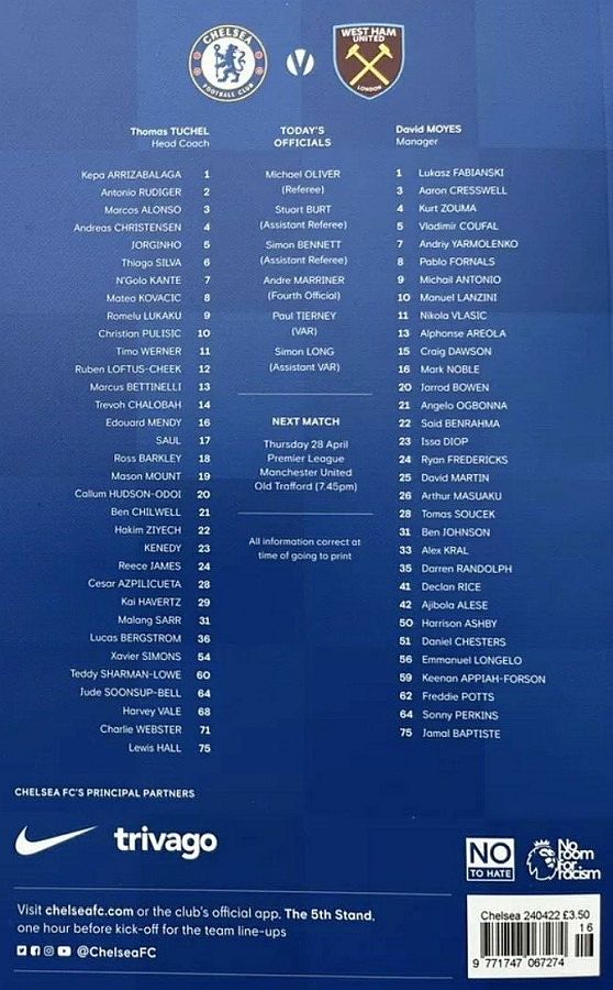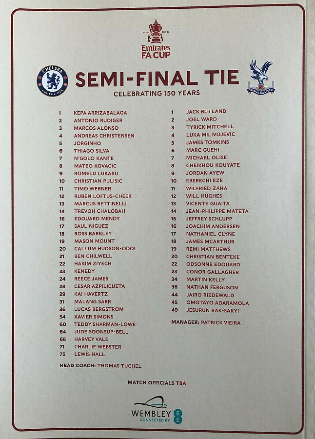 16 Edouard Mendy, 2 Antonio Rudiger, 3 Marcos Alonso, 5 Jorginho ( 8 Mateo Kovacic 46), 6 Thiago Silva, 11 Timo Werner (22 Hakim Ziyech 68), 12 Ruben Loftus-Cheek, 19 Mason Mount, 24 Reece James, 28 Cesar Azpilicueta (10 Christian Pulisic 68), 29 Kai Havertz |
