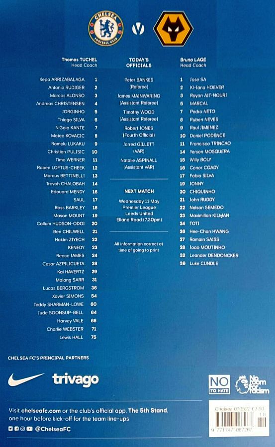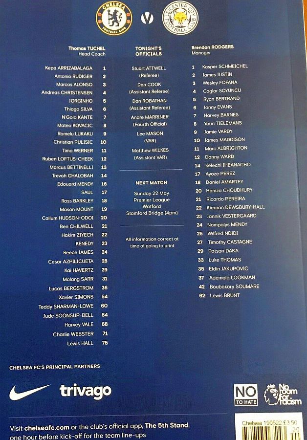 16 Edouard Mendy, 3 Marcos Alonso, 5 Jorginho, 6 Thiago Silva, 7 N'Golo Kante, 11 Timo Werner (10 Christian Pulisic 76), 12 Ruben Loftus-Cheek (22 Hakim Ziyech 76), 14 Trevoh Chalobah, 19 Mason Mount, 28 Cesar Azpilicueta, 29 Kai Havertz ( 9 Romelu Lukaku 76) |