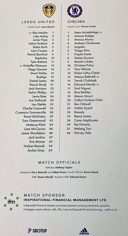Illan Meslier, Robin Koch, Diego Llorente, Liam Cooper, Pascal Struijk, Lewis Bate (Mateusz Klich 59), Kalvin Phillips, Raphinha (Joe Gelhardt 78), Daniel James, Jack Harrison (Junior Firpo 37), Rodrigo |