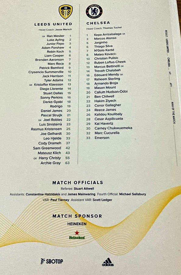 Illan Meslier, Rasmus Kristensen, Robin Koch, Diego Llorente, Pascal Struijk, Marc Roca (Adam Forshaw 61), Tyler Adams, Brenden Aaronson (Mateusz Klich 83), Rodrigo (Joe Gelhardt 82), Jack Harrison (Sam Greenwood 83), Daniel James (Luis Sinisterra 70) |