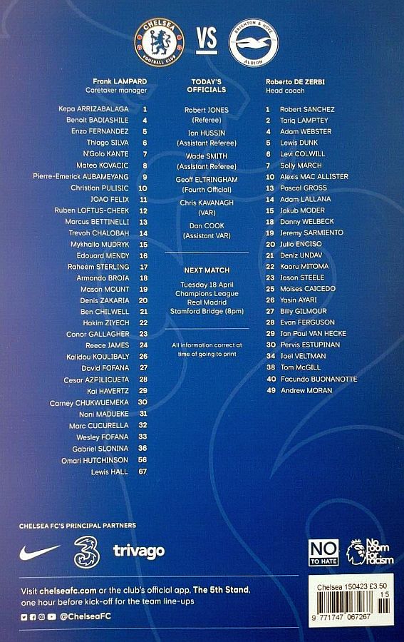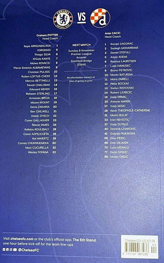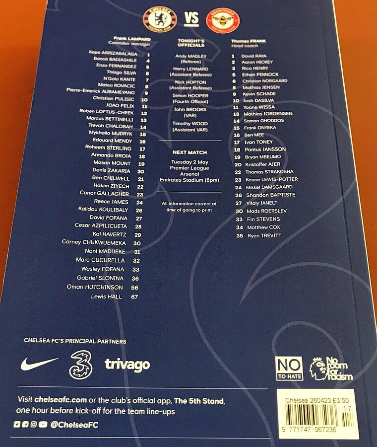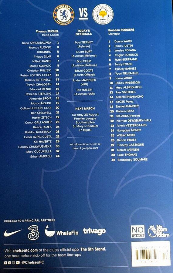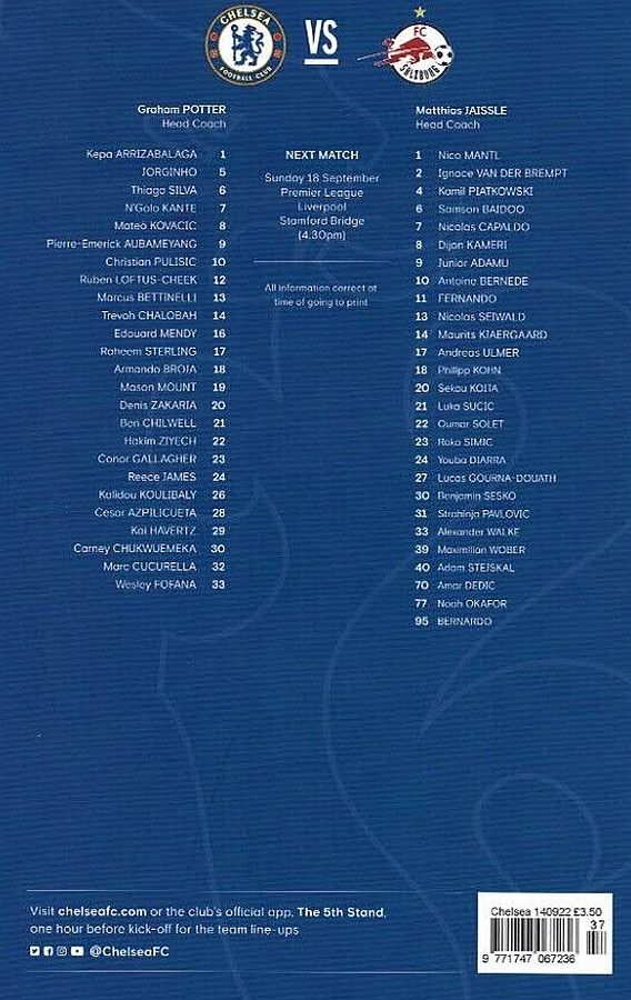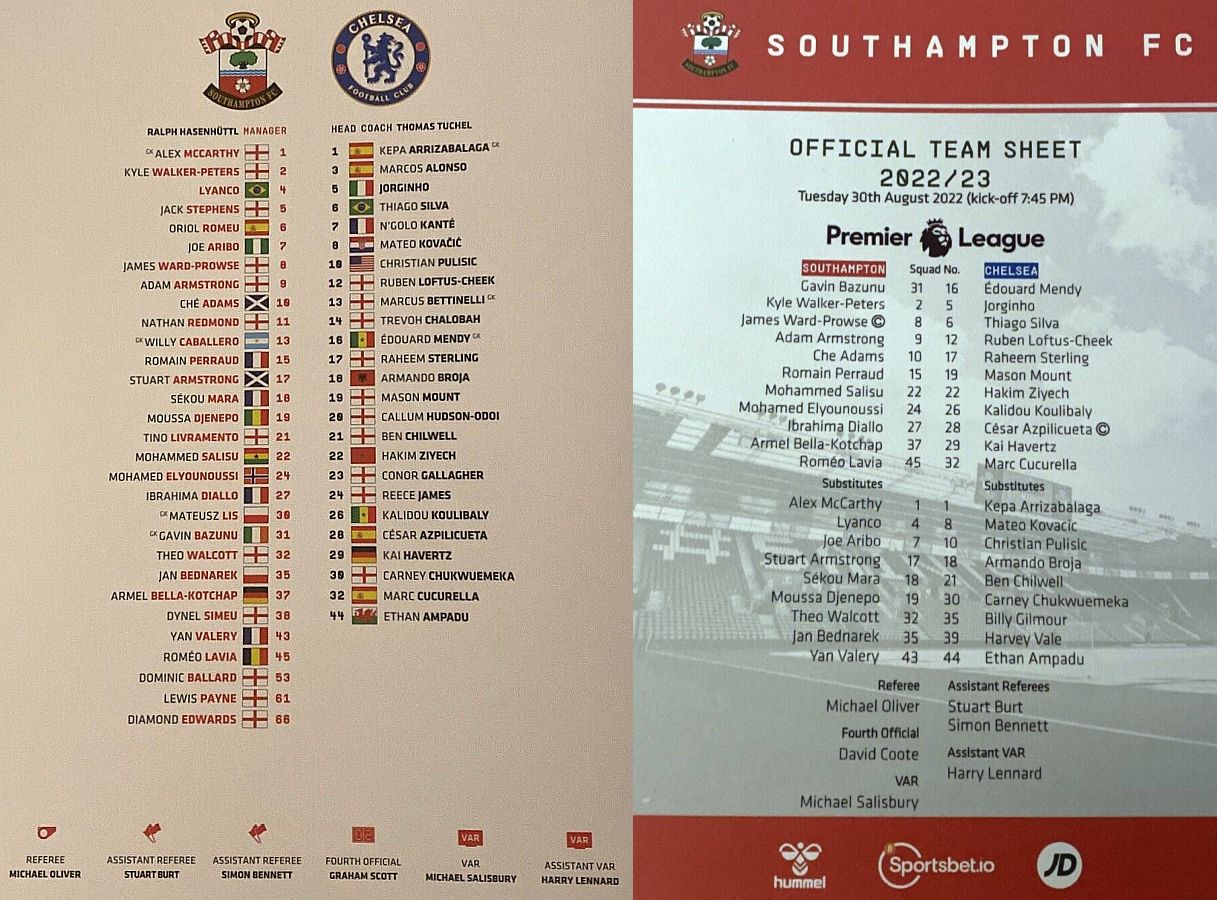 1 Kepa, 14 Trevoh Chalobah, 20 Callum Hudson-Odoi, 30 Carney Chukwuemeka, 44 Ethan Ampadu |