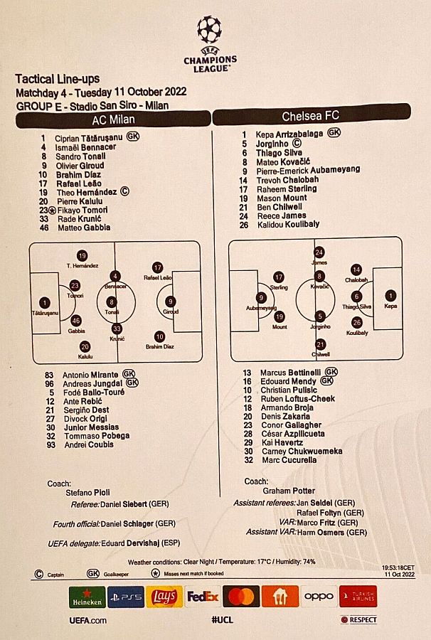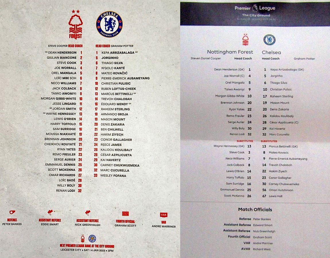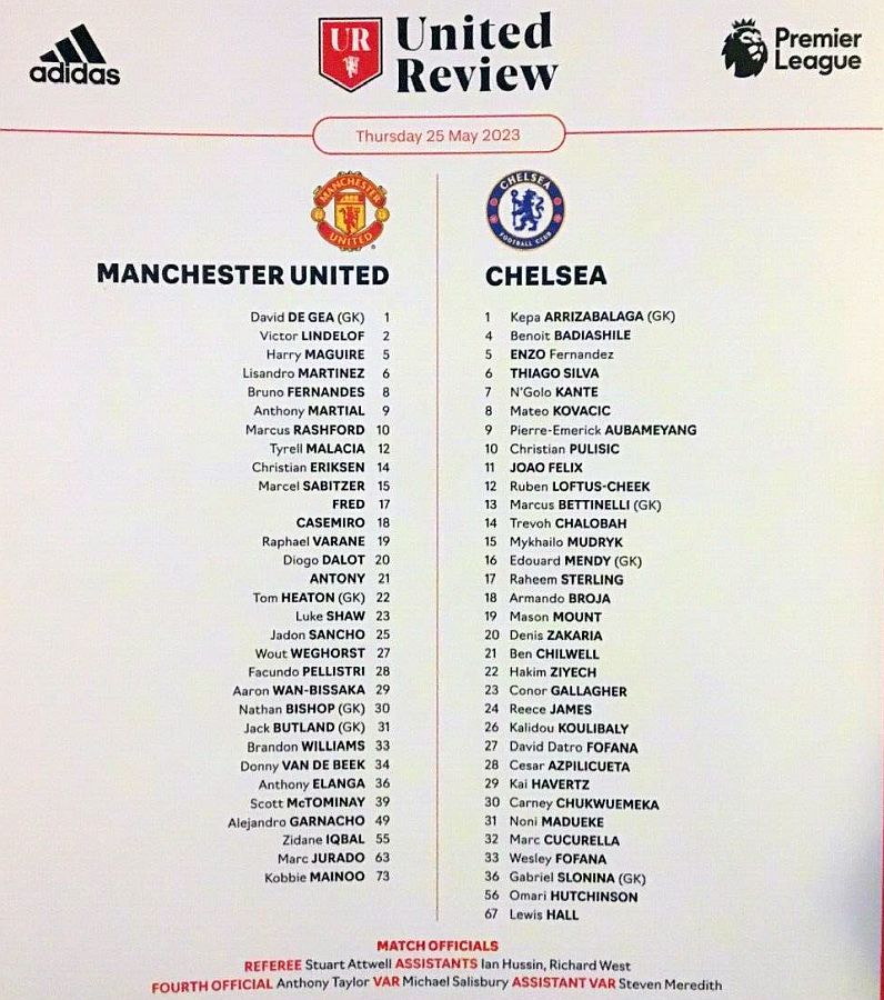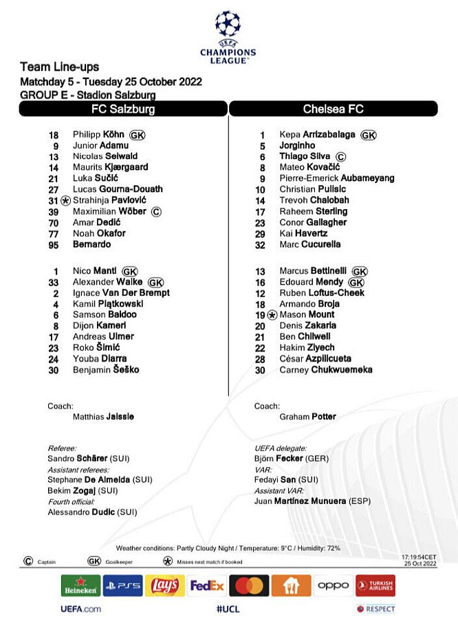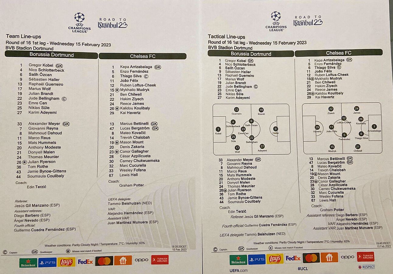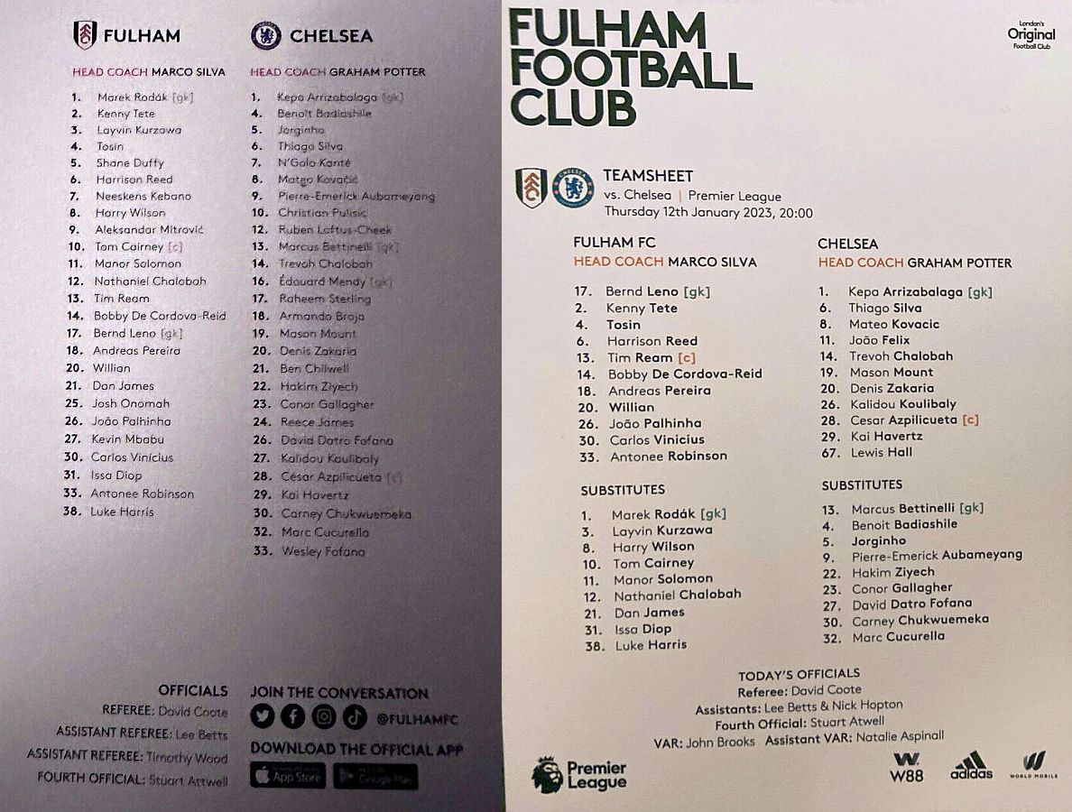1 Kepa, 5 Enzo Fernandez (17 Raheem Sterling 67), 6 Thiago Silva, 7 N'Golo Kante, 8 Mateo Kovacic, 14 Trevoh Chalobah, 23 Conor Gallagher (11 Joao Felix 67), 24 Reece James, 29 Kai Havertz (19 Mason Mount 77), 32 Marc Cucurella (15 Mykhailo Mudryk 68), 33 Wesley Fofana |