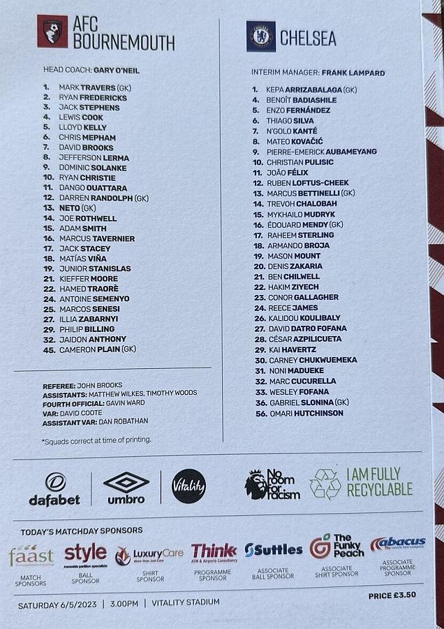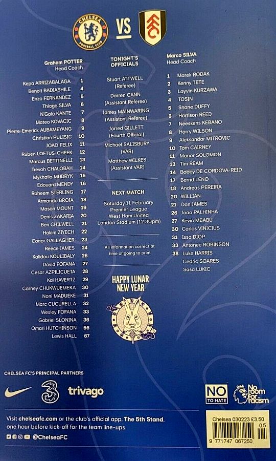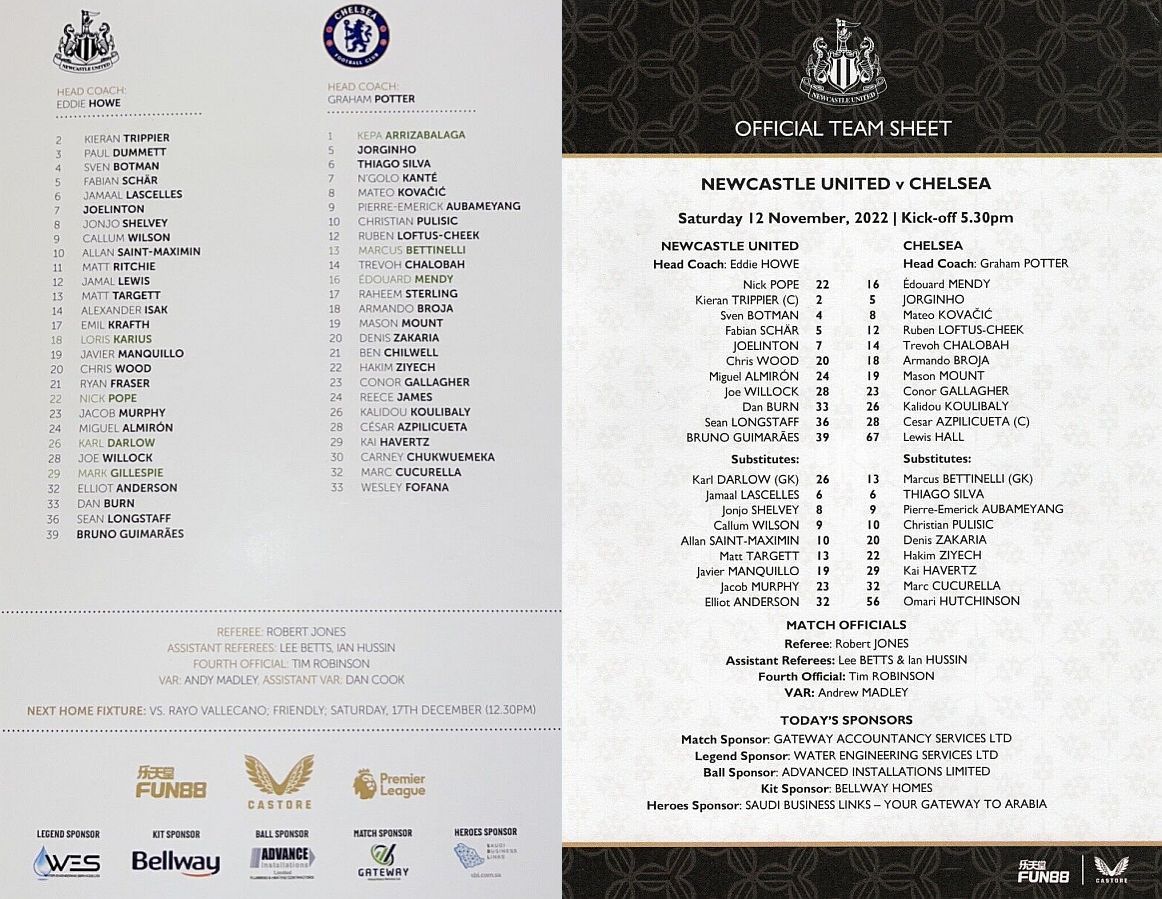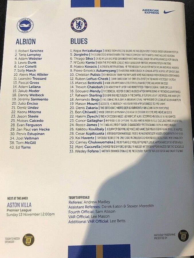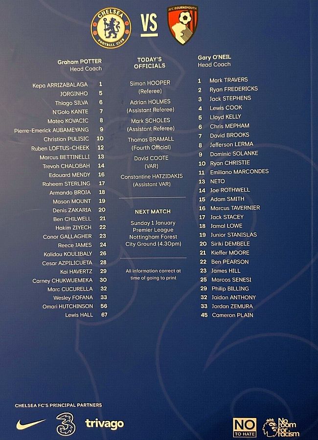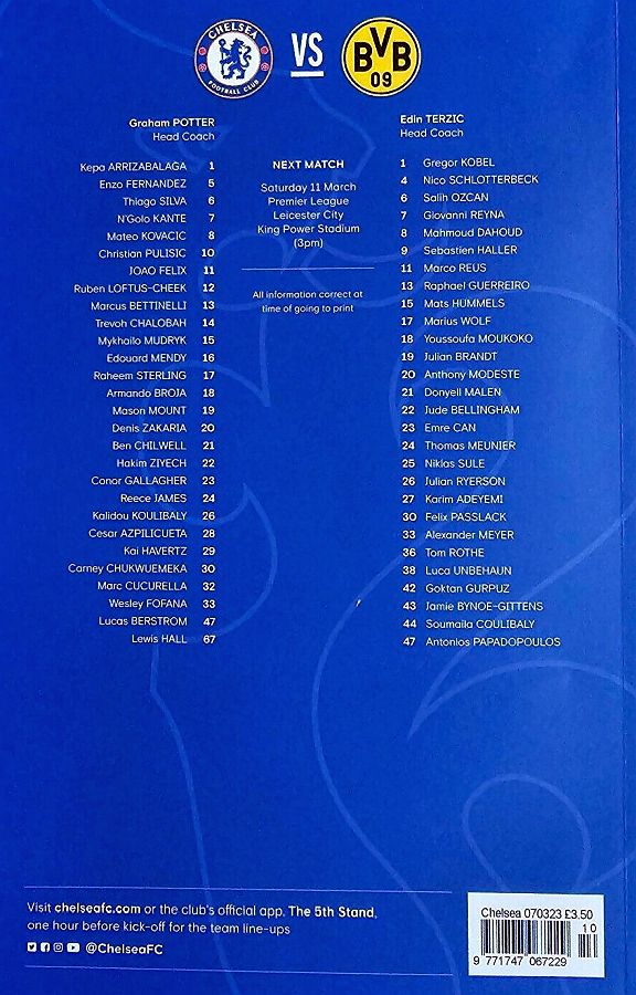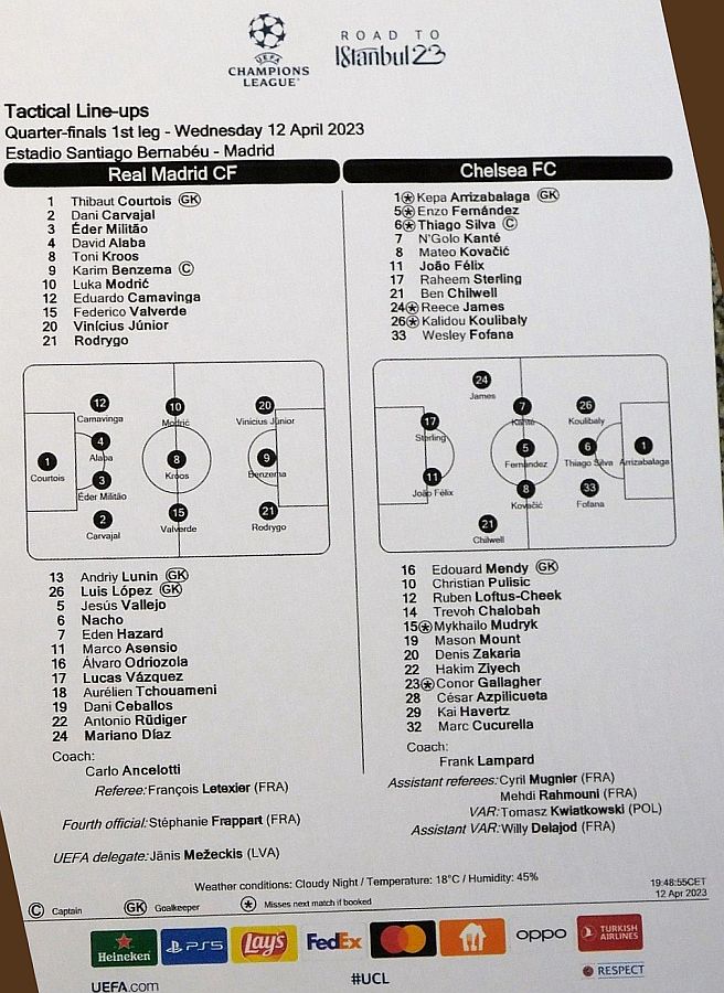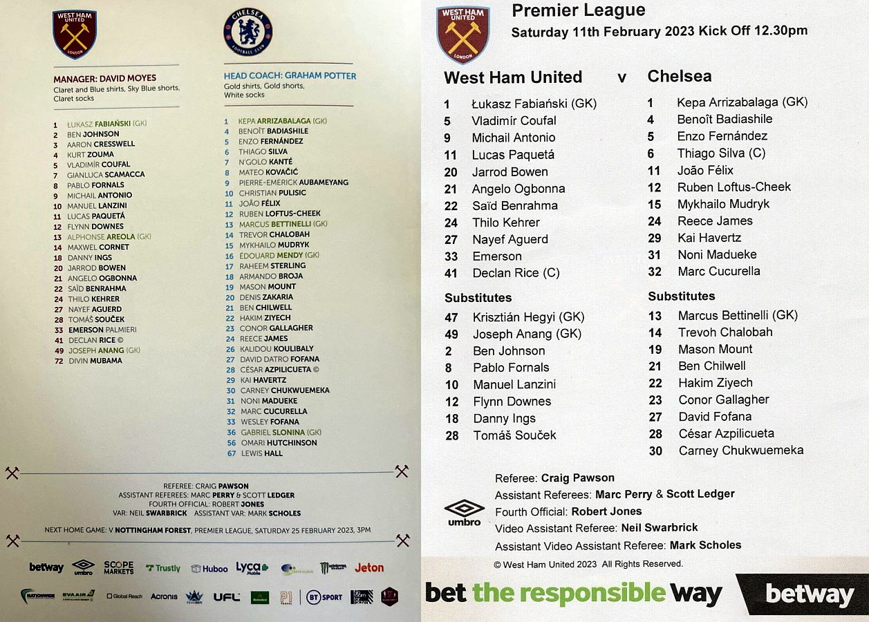 1 Kepa, 5 Enzo Fernandez (17 Raheem Sterling 67), 6 Thiago Silva, 7 N'Golo Kante, 8 Mateo Kovacic, 14 Trevoh Chalobah, 23 Conor Gallagher (11 Joao Felix 67), 24 Reece James, 29 Kai Havertz (19 Mason Mount 77), 32 Marc Cucurella (15 Mykhailo Mudryk 68), 33 Wesley Fofana |